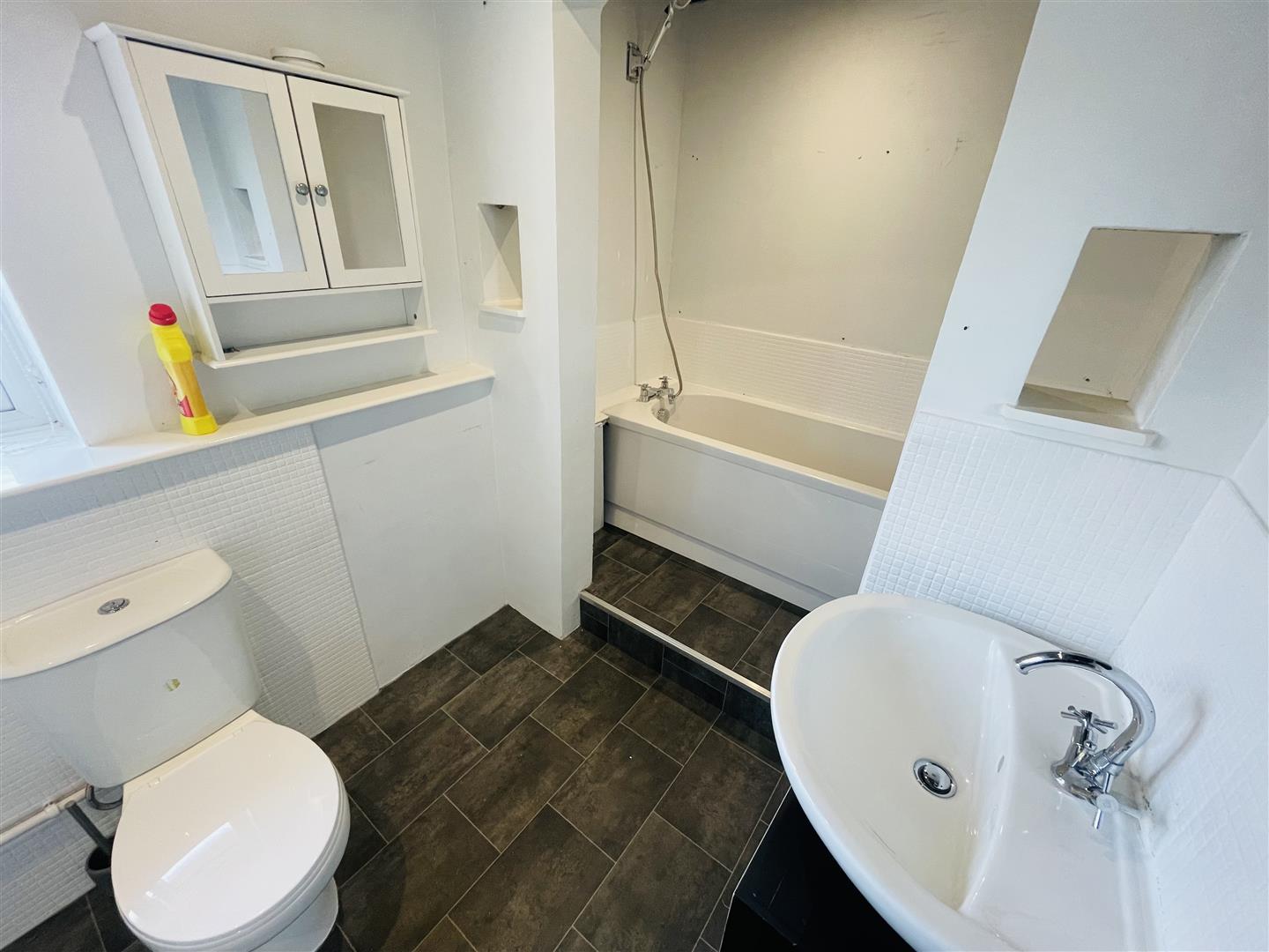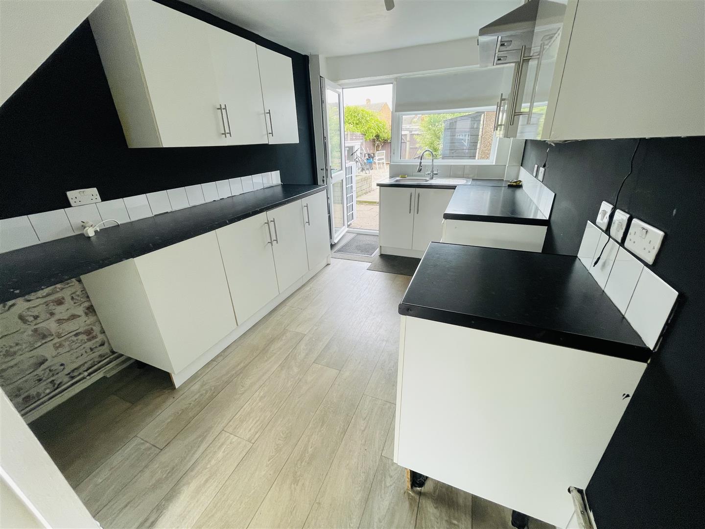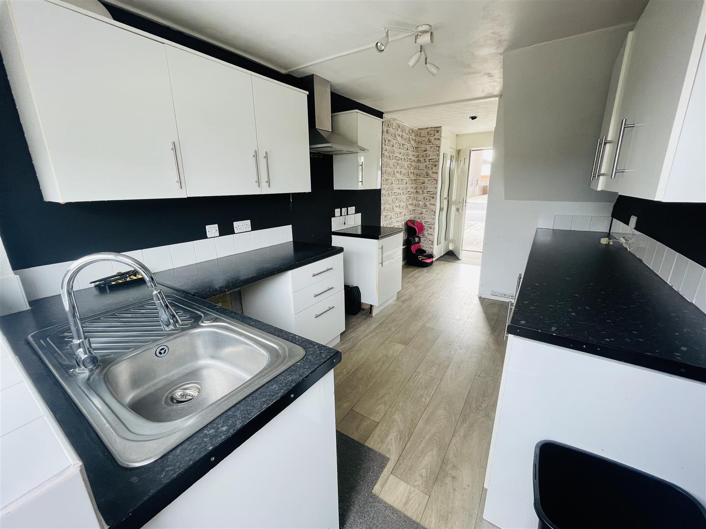 Fitted with a matching range of base and eye level units with worktop space over, stainless steel sink unit with mixer tap with tiled splashbacks, plumbing for washing machine, electric point for cooker, double glazed window to rear, double radiator, double glazed obscure door to garden