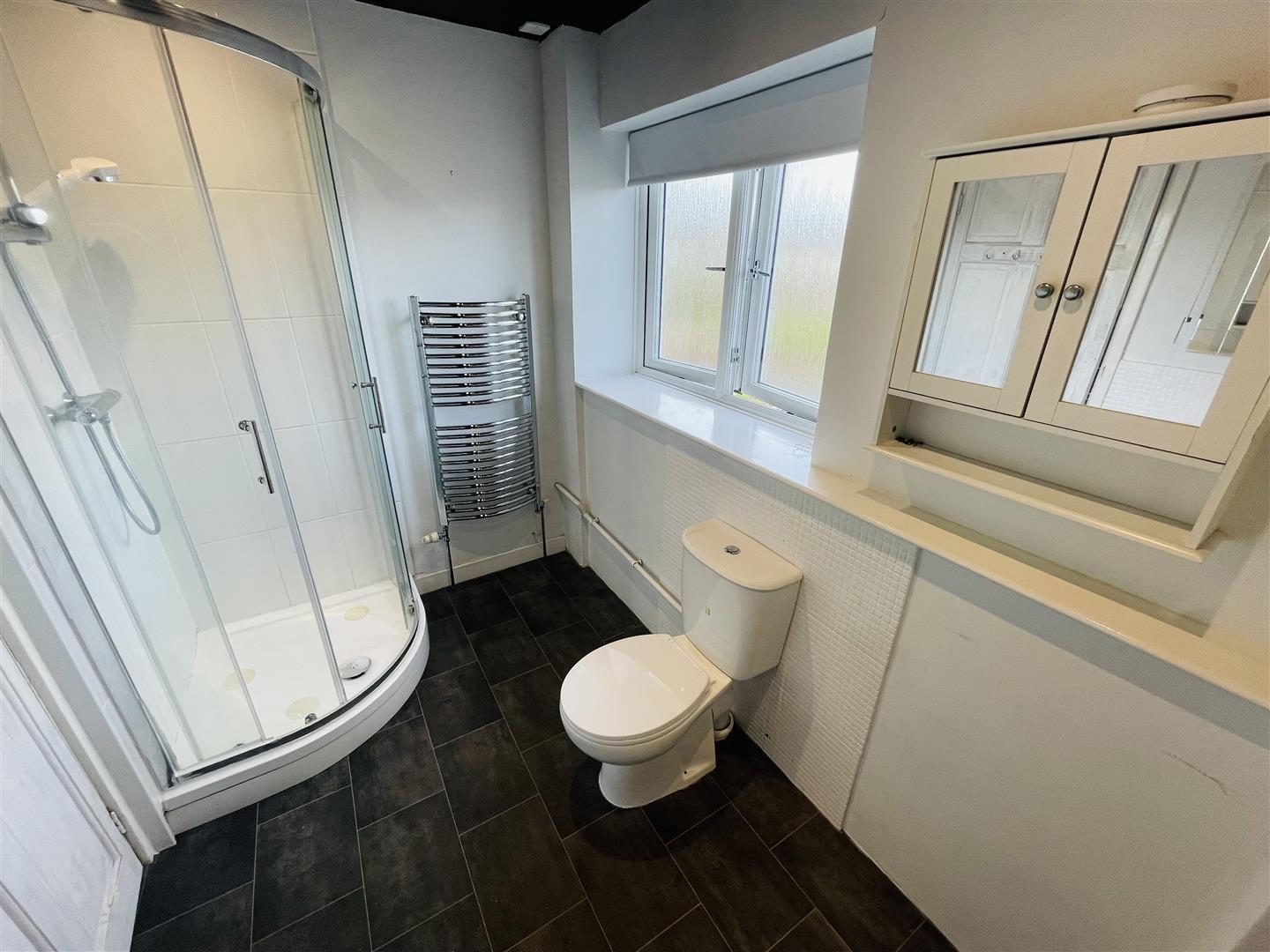 Fitted with four piece suite with panelled bath with shower over, pedestal wash hand basin with swan neck mixer tap, tiled shower cubicle and low-level WC, tiled splashbacks, heated towel rail, extractor fan, double glazed window to rear with sunken ceiling spotlights, access to loft space, door to: