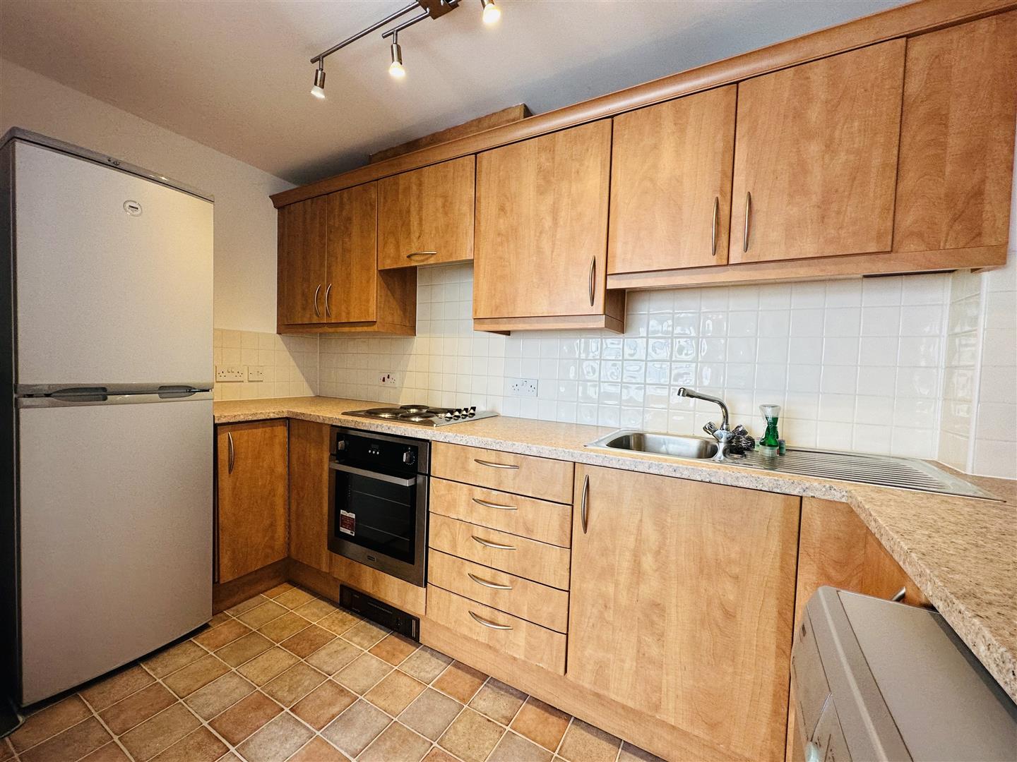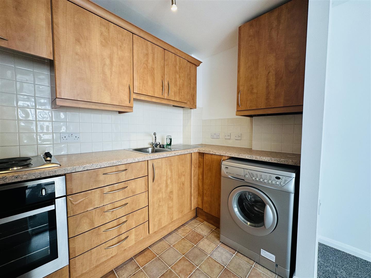 Fitted with a matching range of base and eye level units with worktop space over, stainless steel sink unit with mixer tap with tiled splashbacks, plumbing for washing machine, space for fridge/freezer, built-in electric oven, four ring hob with pull out extractor hood over, concealed combination boiler serving heating system and domestic hot water.