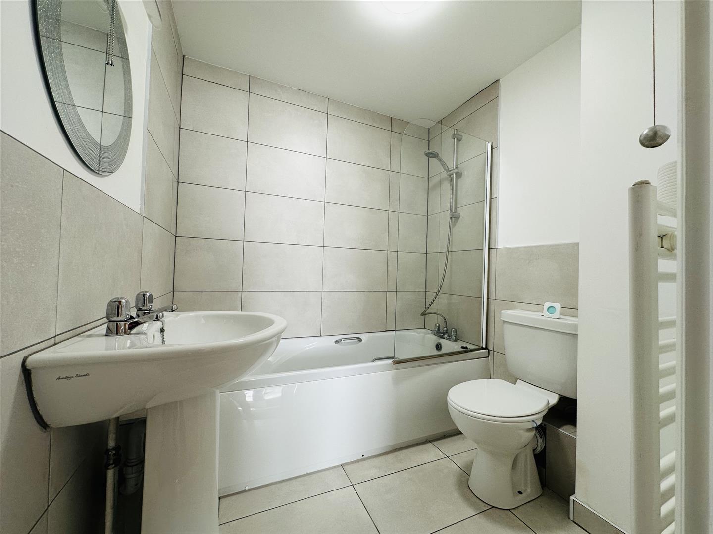 Fitted with two piece suite comprising panelled bath with shower over and glass screen, pedestal wash hand basin and low-level WC, tiled splashbacks, heated towel rail, extractor fan, shaver point and light, ceramic tiled flooring.