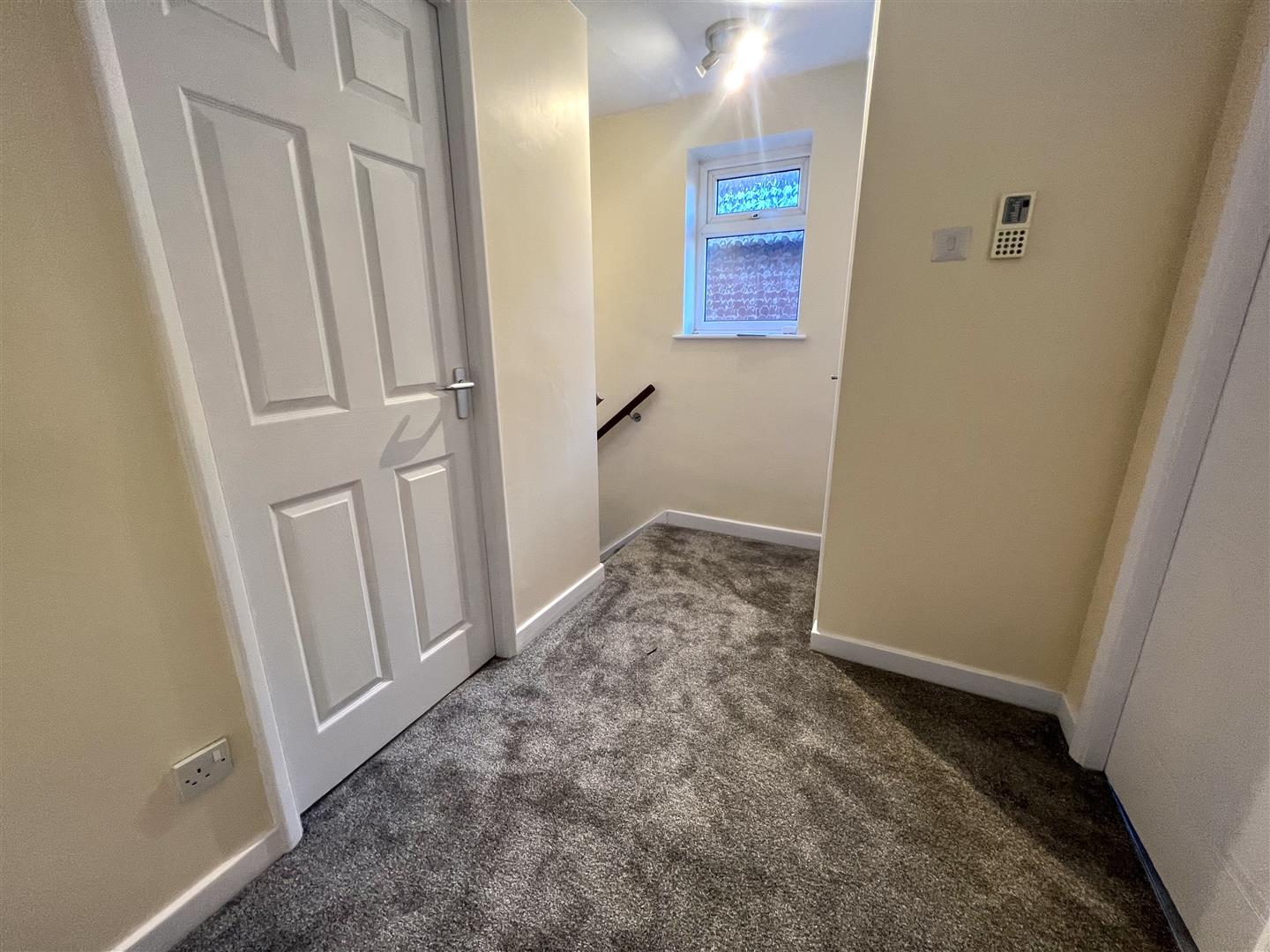 Obscure double glazed window to side, access to loft space with pull down ladder, doors to: