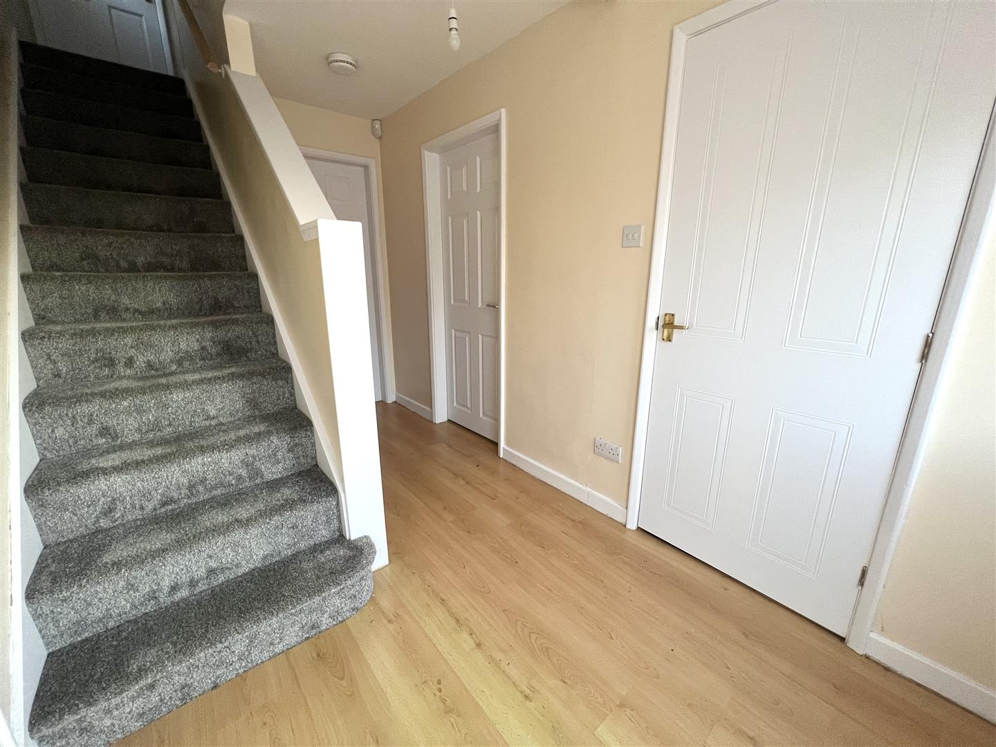 Radiator, wooden laminate flooring, telephone point, stairs to first floor landing with under-stairs storage cupboard, doors to: