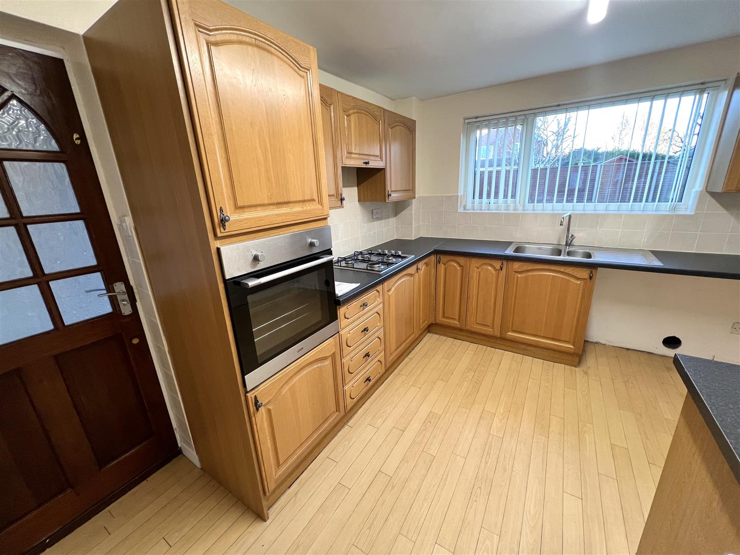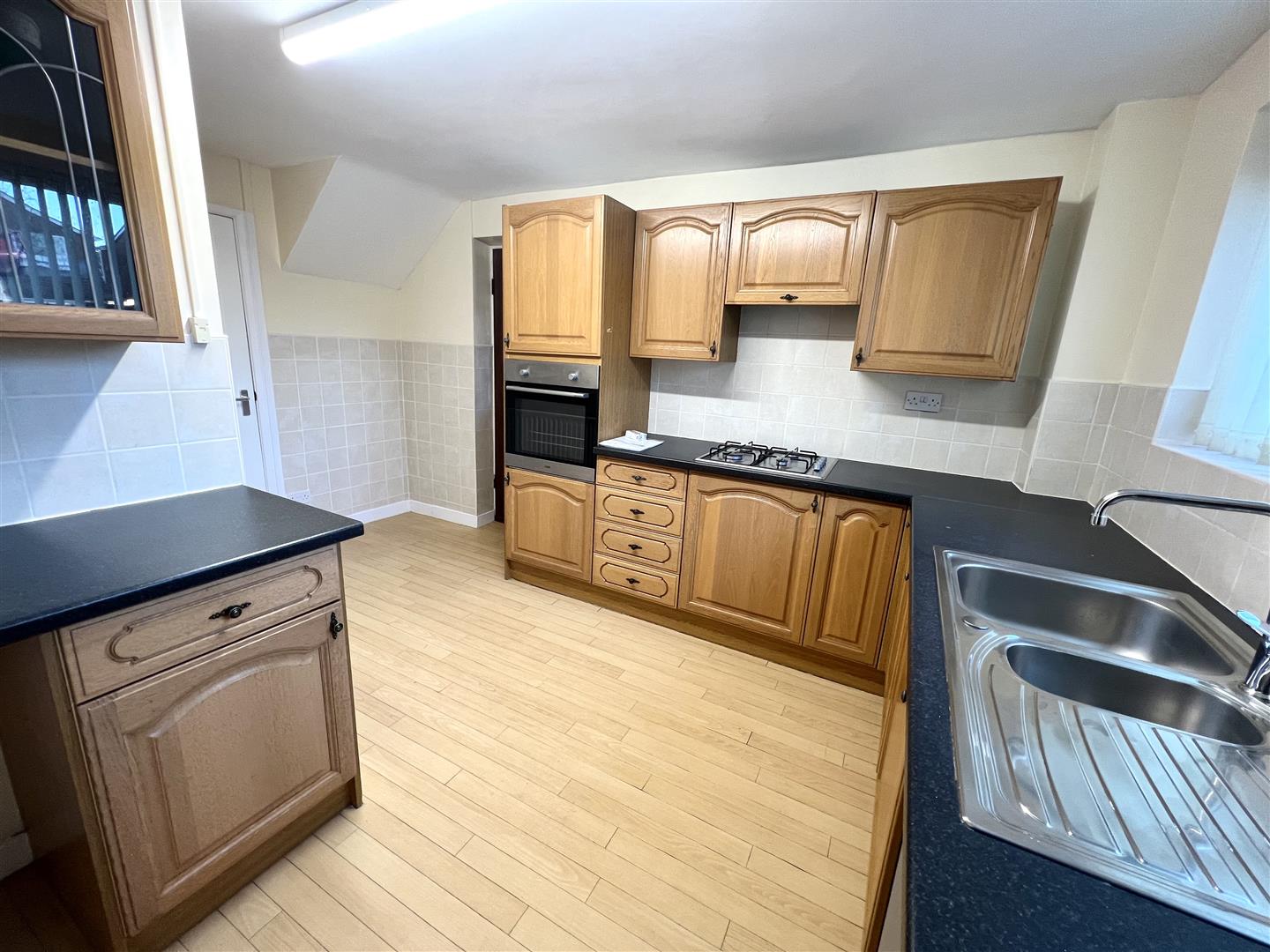 Fitted with a matching range of base and eye level units with worktop space over, 1+1/4 bowl stainless steel sink unit with single drainer, mixer tap and tiled splashbacks, plumbing for washing machine, space for fridge/freezer and tumble dryer, eye level electric fan assisted oven, four ring gas hob with extractor hood over, double glazed window to rear, radiator, door to side.