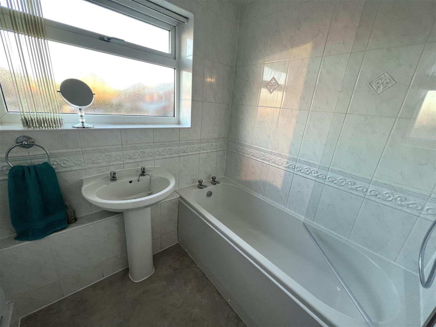 Fitted with piece suite comprising panelled bath with shower over and glass screen and pedestal wash hand basin, tiled surround, extractor fan, obscure double glazed window to rear, heated towel rail, door to: