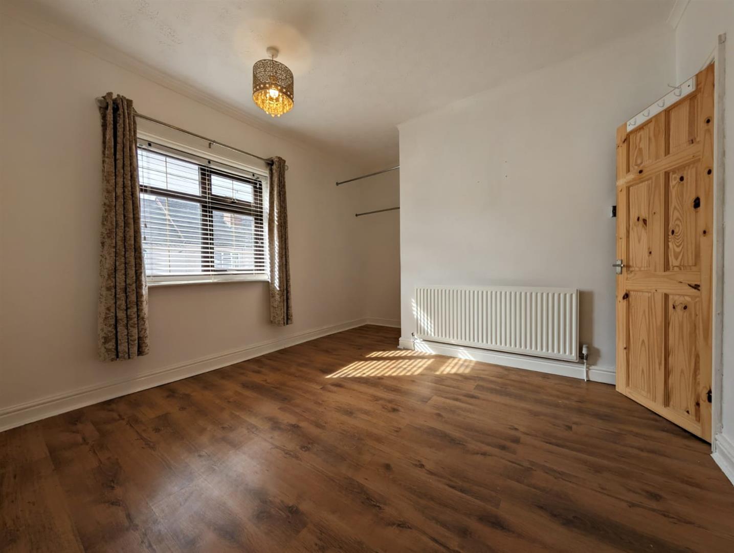 Double radiator, wooden laminate flooring, stairs to first floor landing, door to: