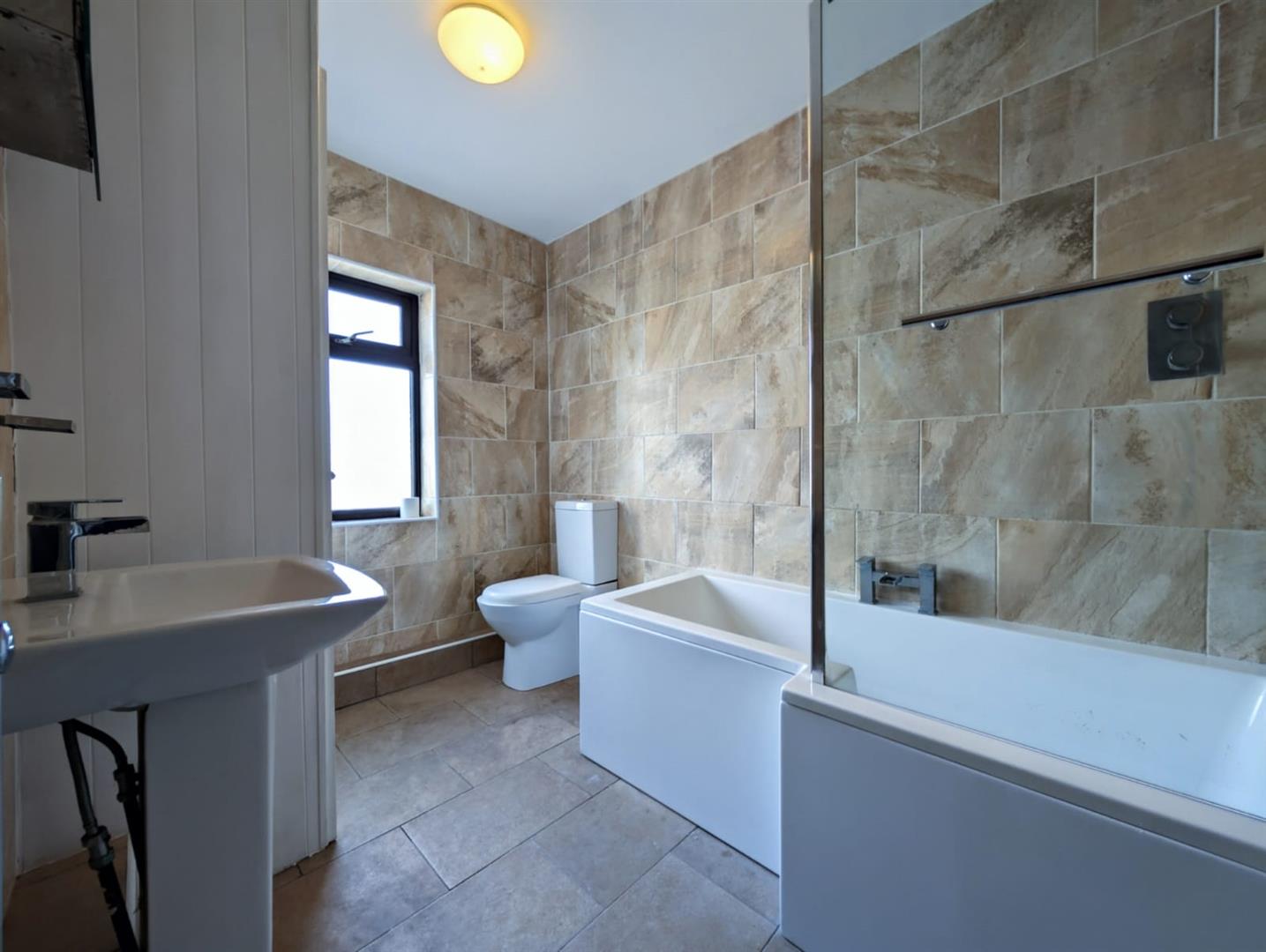 Fitted with three piece suite comprising panelled bath with shower over and glass screen, pedestal wash hand basin with mixer tap and low-level WC, tiled surround, obscure double glazed window to rear, heated towel rail, ceramic tiled flooring, door to Storage cupboard housing wall mounted combination boiler serving heating system and domestic hot water.