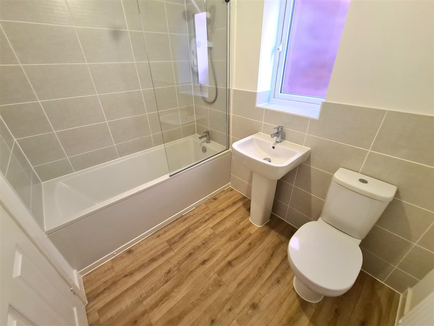 Fitted with three piece suite comprising of panelled bath with shower over, mixer tap and folding glass screen, wash hand basin with mixer tap and low-level WC, double glazed window to side, radiator & laminate flooring.