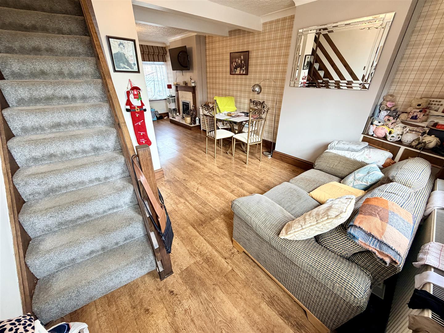 Double glazed windows to front and rear, coal effect living flame effect gas fire set in Adam style surround and marble effect hearth, two double radiators, wooden laminate flooring, textured ceiling, stairs to first floor and door to: