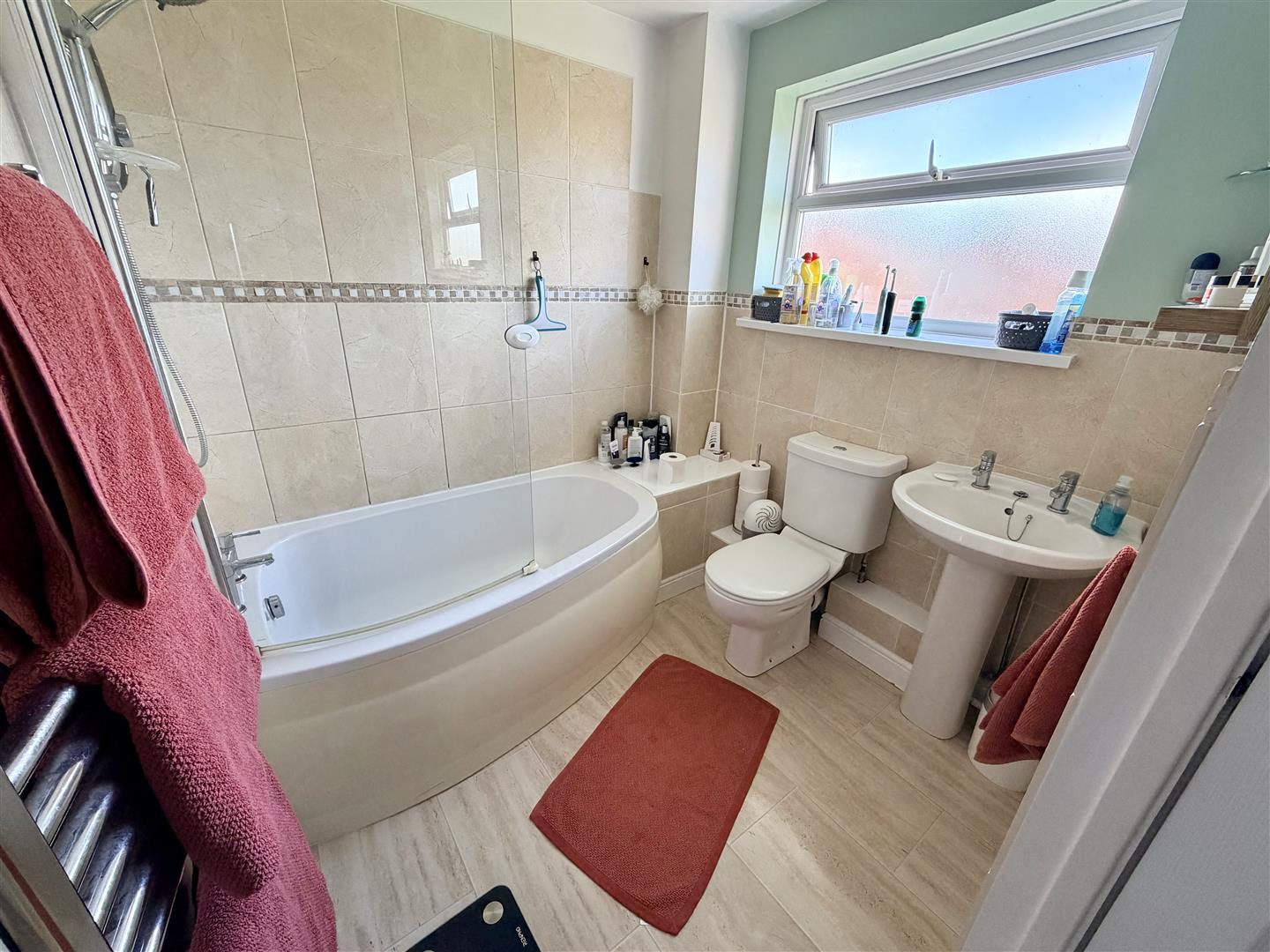 Fitted with three piece suite comprising panelled bath, pedestal wash hand basin and low-level WC, tiled splashbacks, heated towel rail, extractor fan, obscure double glazed window to rear, door to