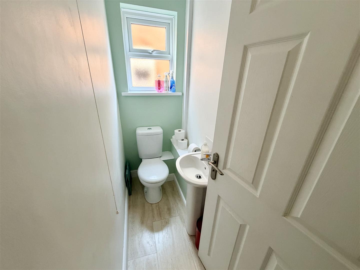 Obscure double glazed window to side, fitted with two piece suite comprising, wash hand basin and low-level WC, tiled splashback, door.