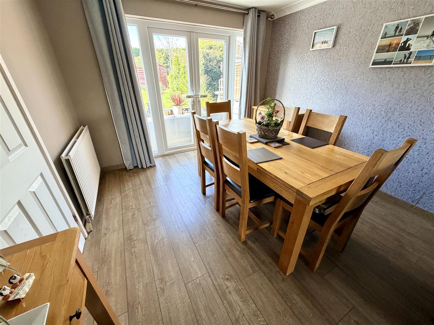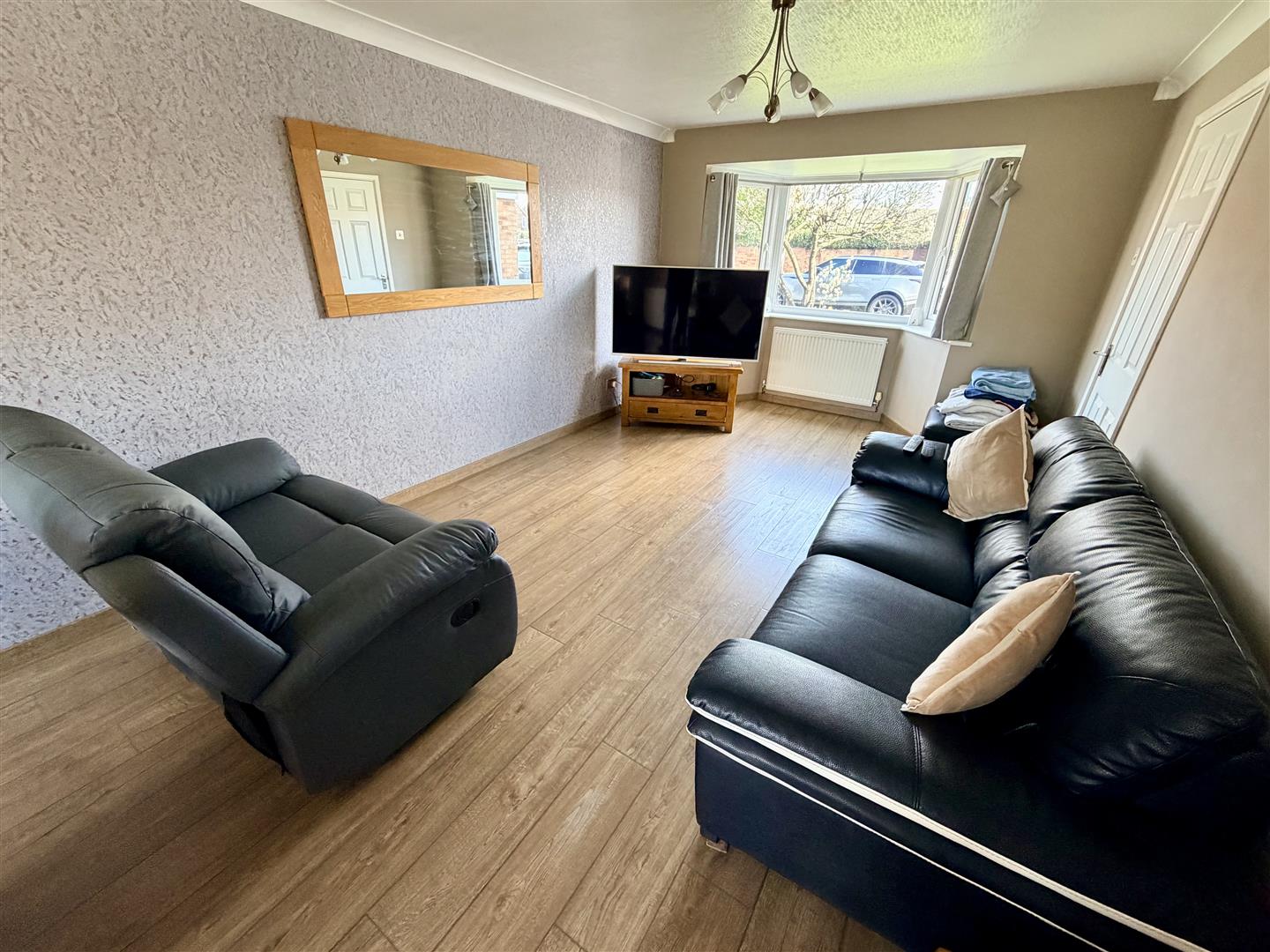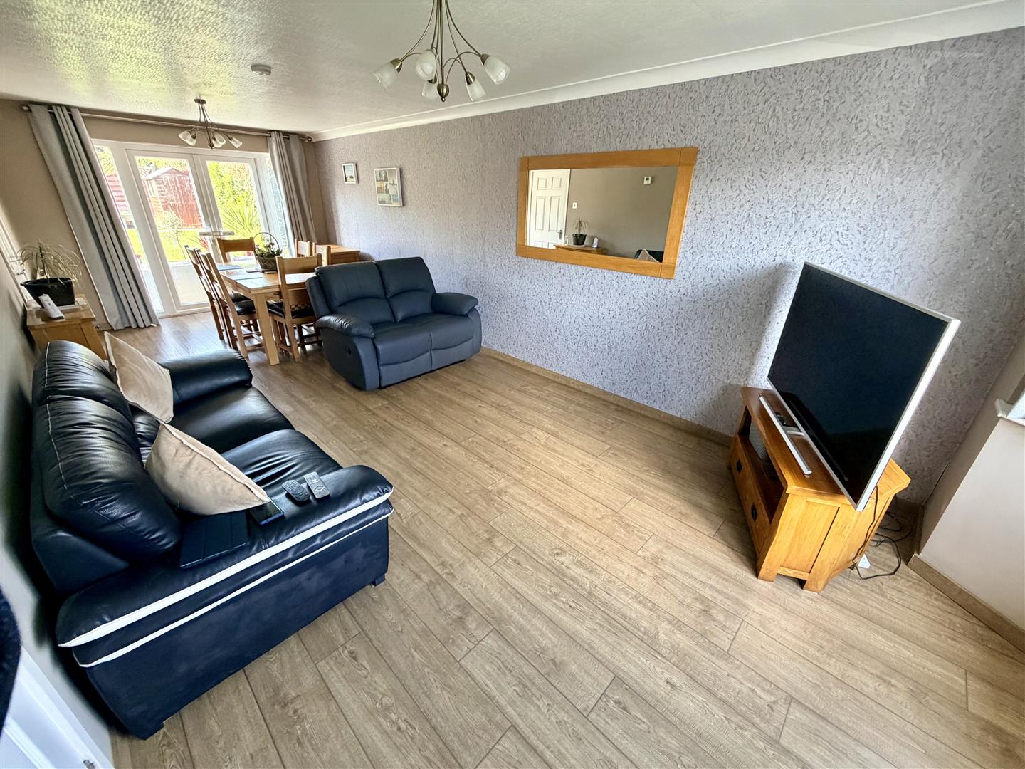 Double glazed bay window to front, double radiators, wooden laminate flooring, TV point, coving to textured ceiling, double glazed French style double doors to garden, door to: