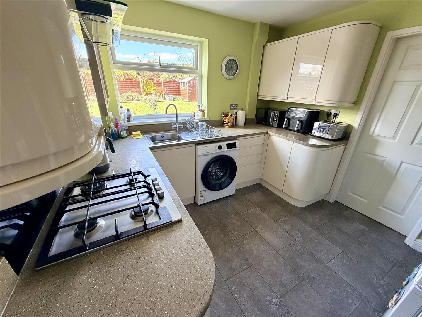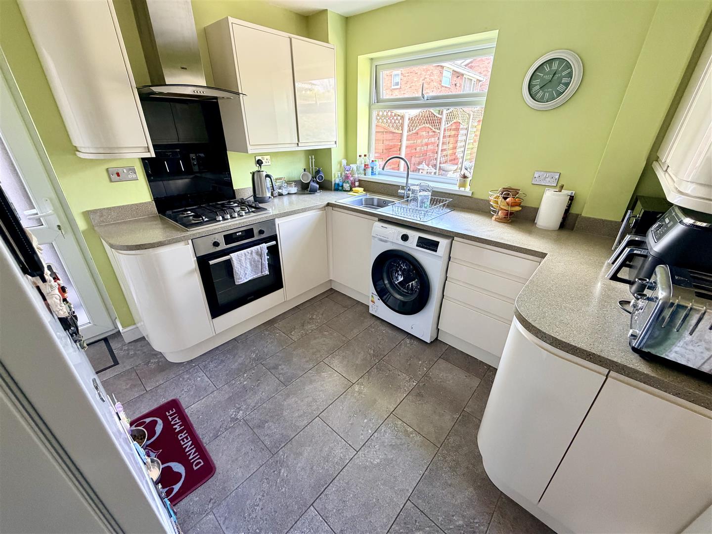 Fitted with a matching range of with worktop space over, stainless steel sink unit with swan neck mixer tap, plumbing for washing machine, space for fridge/freezer, electric fan assisted, four ring gas hob with extractor hood over, double glazed window to rear, ceramic tiled flooring, double glazed door to side, door leading back to the hallway.