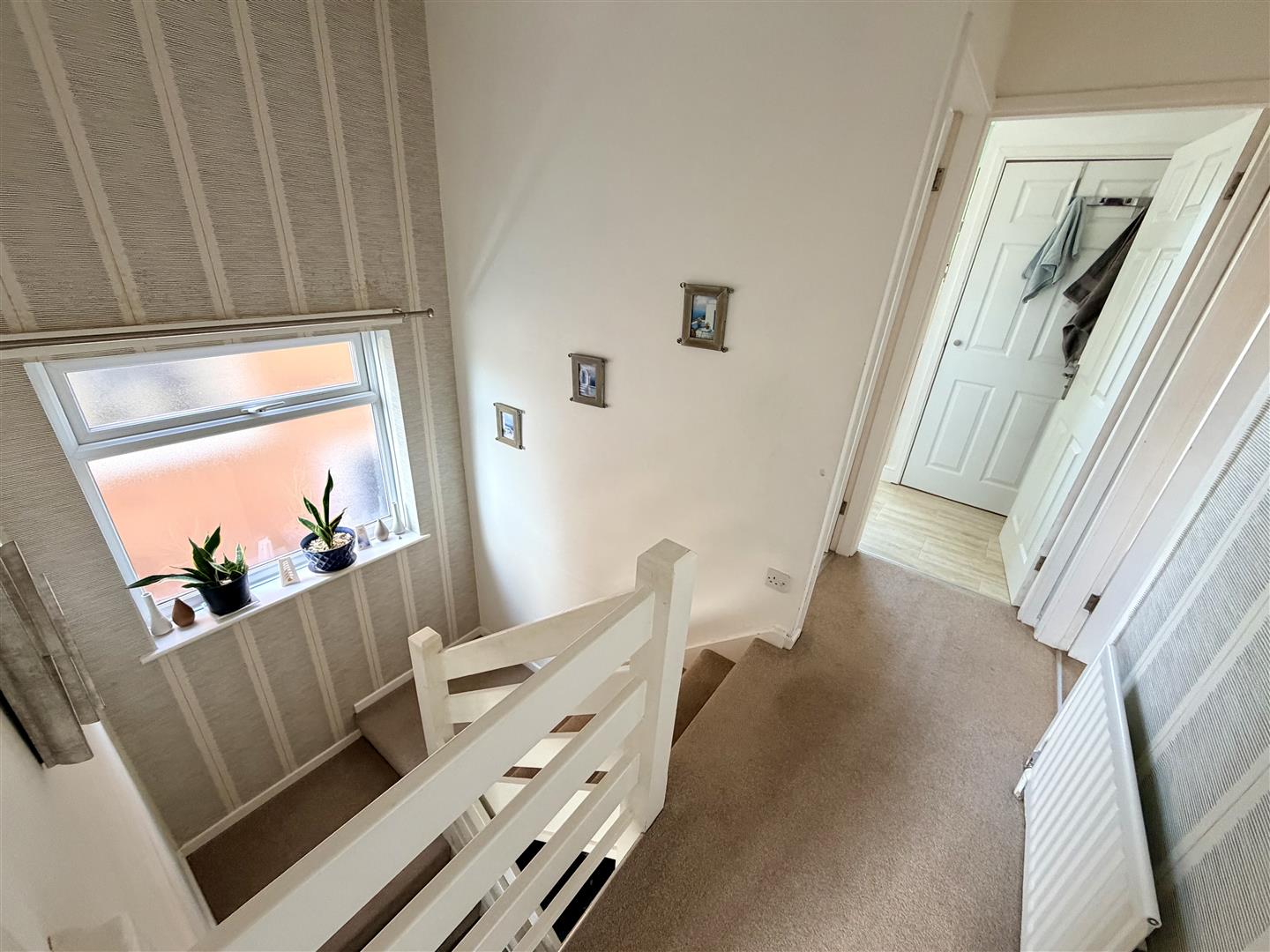 Obscure double glazed window to side, radiator, access to loft space, doors to: