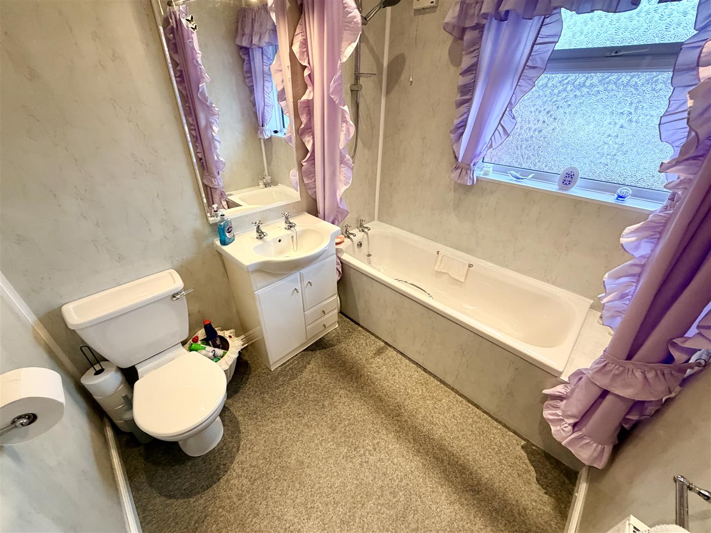 Obscure double glazed window to side, fitted with two piece suite comprising, vanity wash unit with cupboard under, mixer tap and tiled splashback, low-level WC and extractor fan, wooden laminate flooring, textured ceiling.