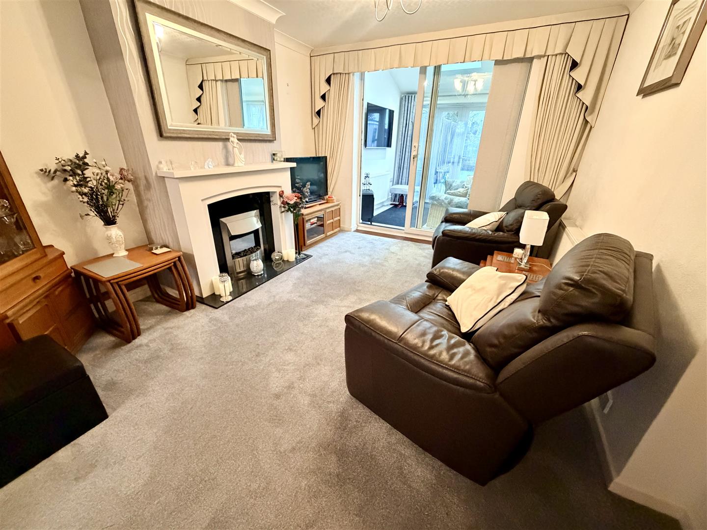 Living flame effect electric fire set in feature surround and hearth, double radiator, coving to textured ceiling, double glazed sliding patio door, opening into