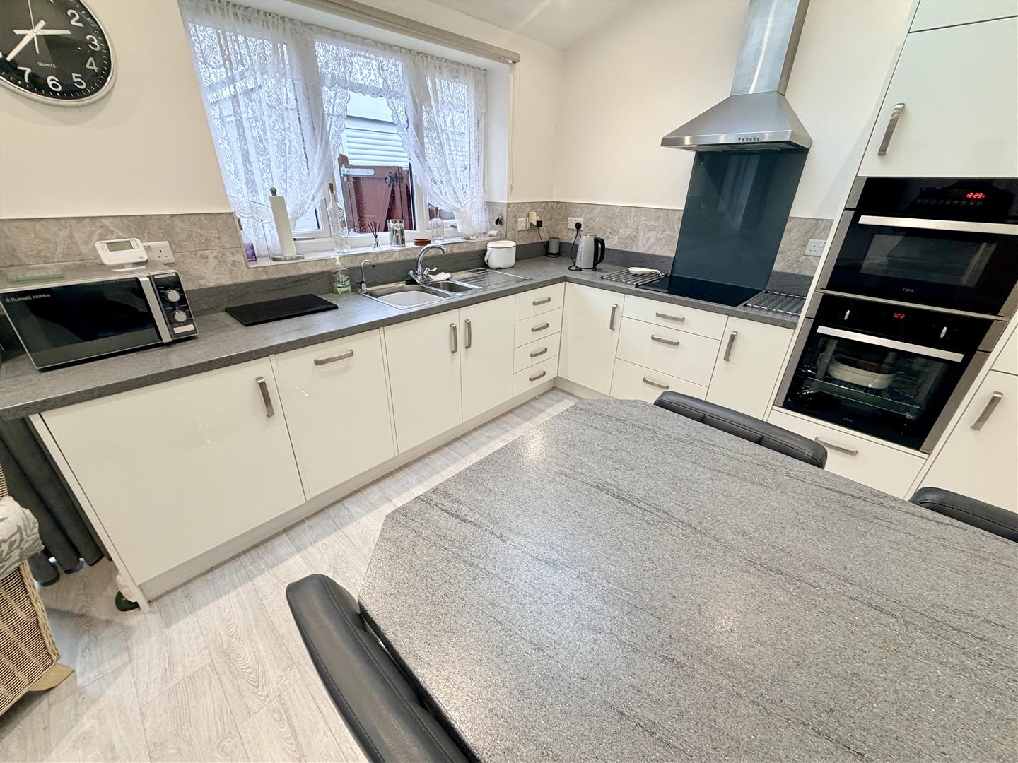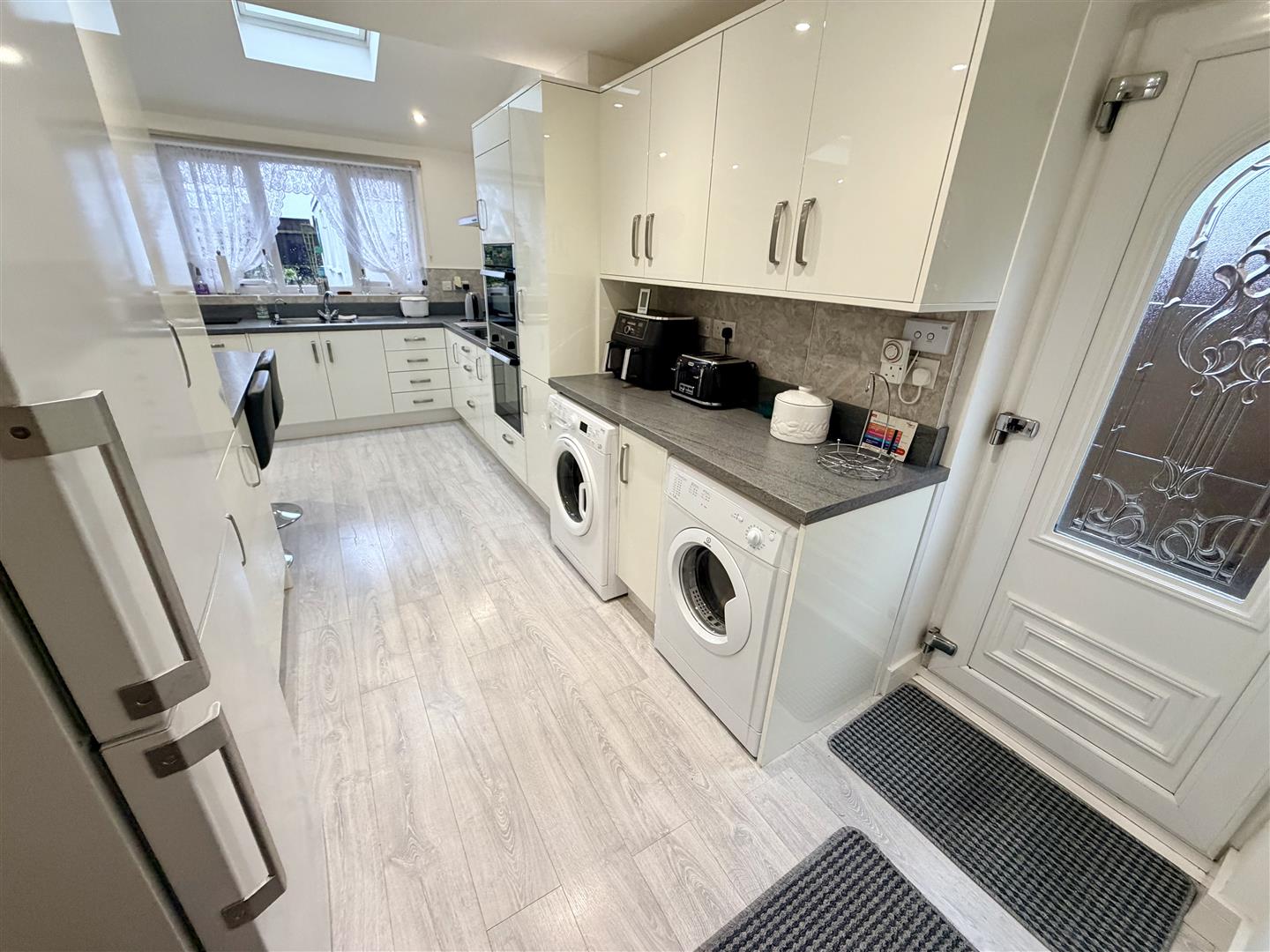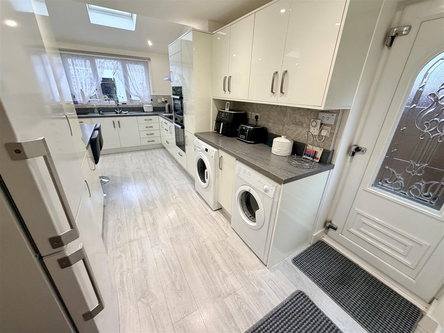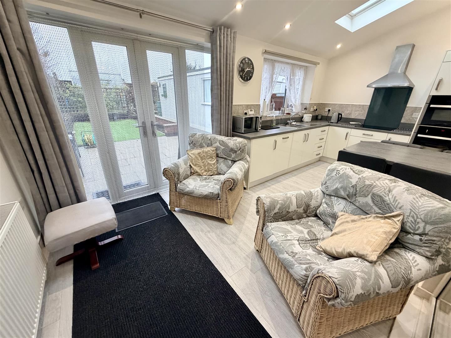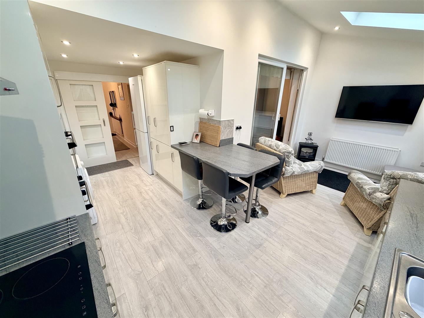 Fitted with a matching range of base and eye level units, breakfast bar, 1+1/4 bowl stainless steel sink unit with single drainer, stainless steel mixer tap and tiled splashbacks, plumbing for washing machine, space for fridge/freezer and tumble dryer, electric fan assisted oven, electric hob with extractor hood over, built-in microwave, double glazed window to rear, two double glazed skylights, double radiator, wooden laminate flooring, sunken spotlights, double glazed door to side, double glazed French double doors to garden.