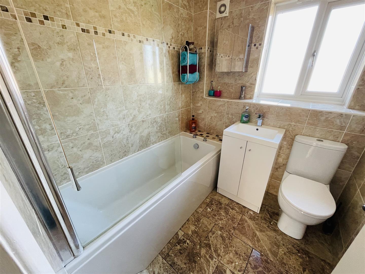 Fitted with three piece suite comprising panelled bath with shower over and glass screen, vanity wash unit with cupboard under and mixer tap and low-level WC, heated towel rail, extractor fan, double glazed window to front.