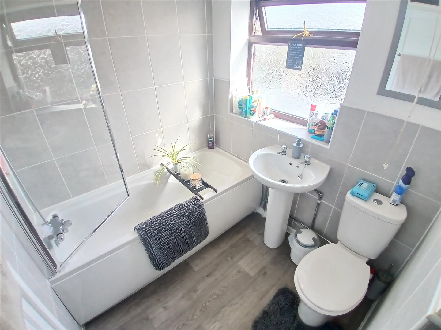Fitted with a panelled with screen, WC, hand wash basin, combination boiler and obscure double glazed window to rear.