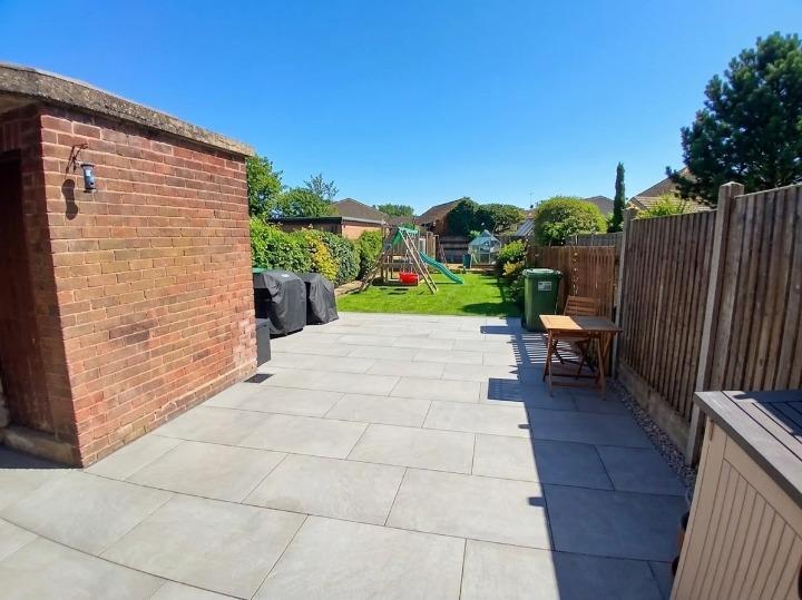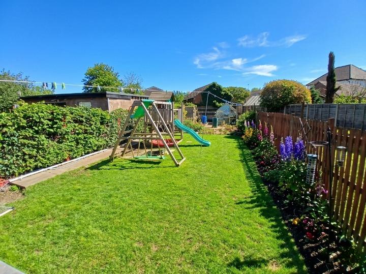 To front there is a lawned garden with shurbs and pathway upto property, side gated access to rear made up of lawn and patio areas and brick built stores.