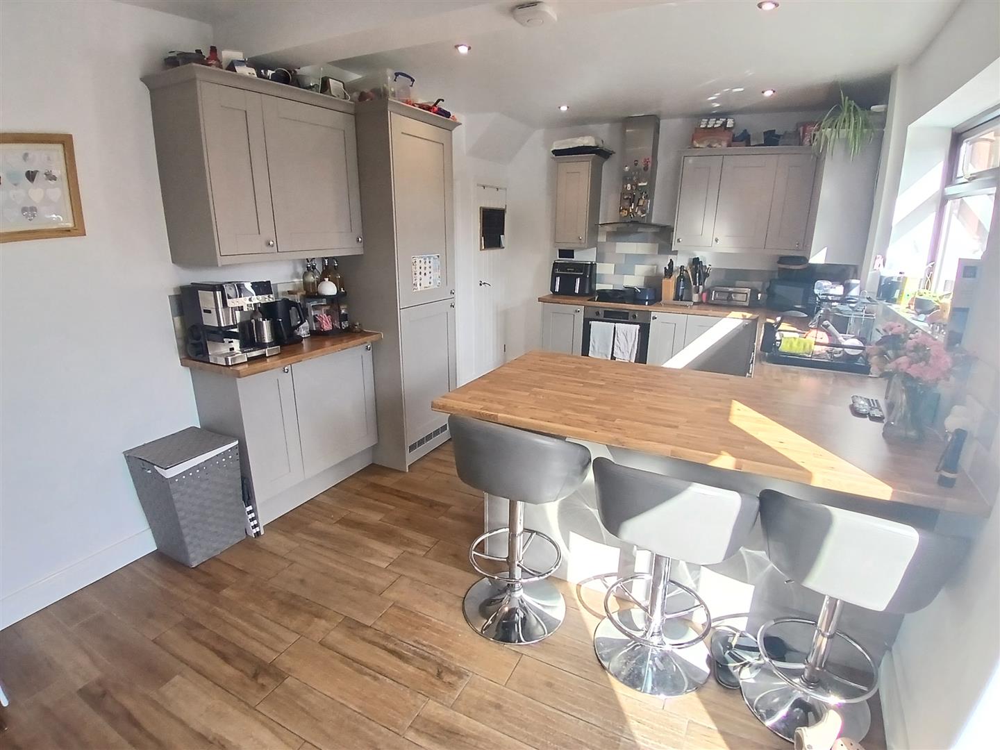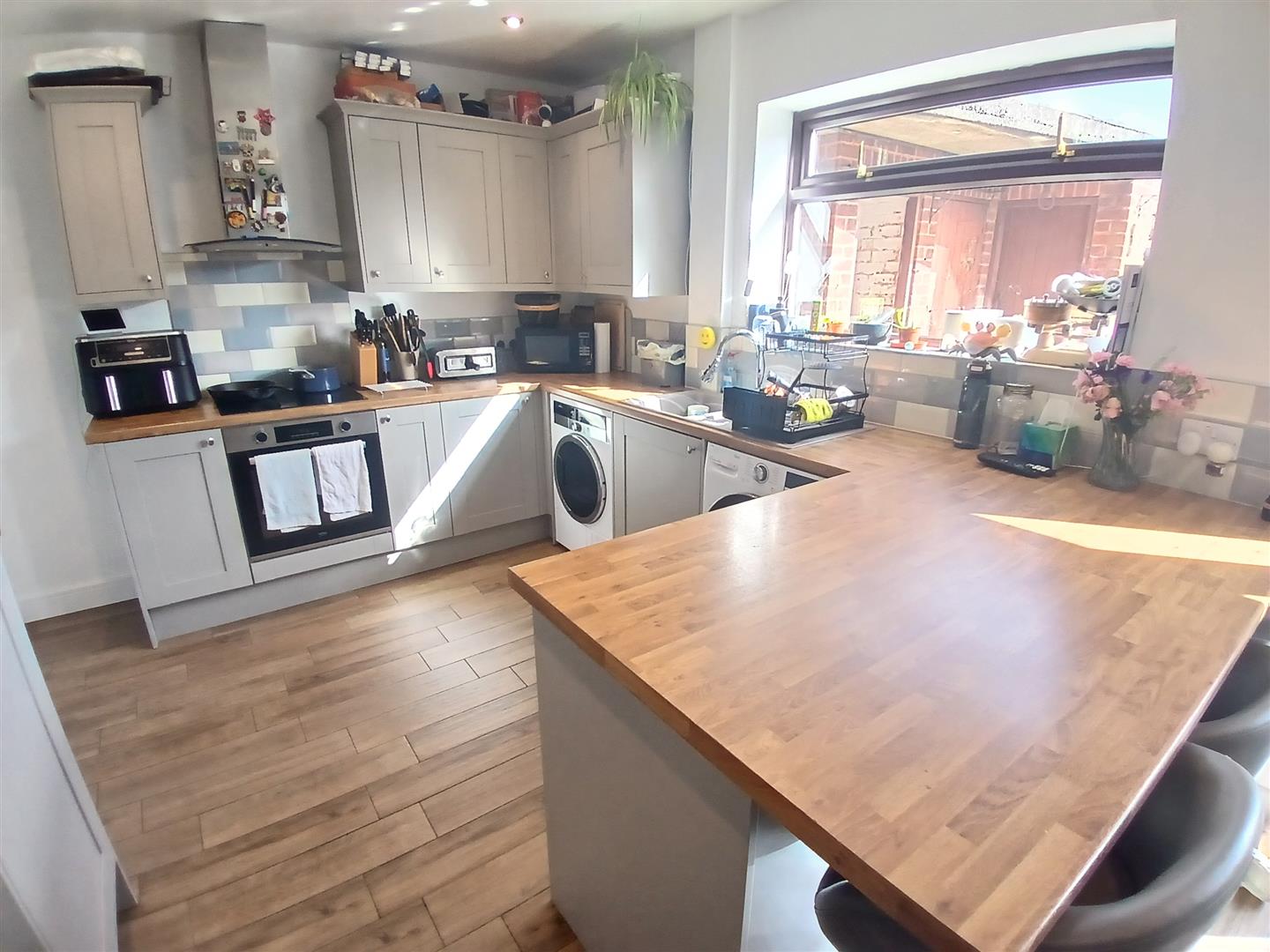 Fitted with a matching range of base and eye level units with worktop space over, sink unit with single drainer and taps over, fitted induction hob with hood over and fan assisted oven, space/plumbing for appliances, under stairs storage cupboard, double glazed window and french doors to rear.