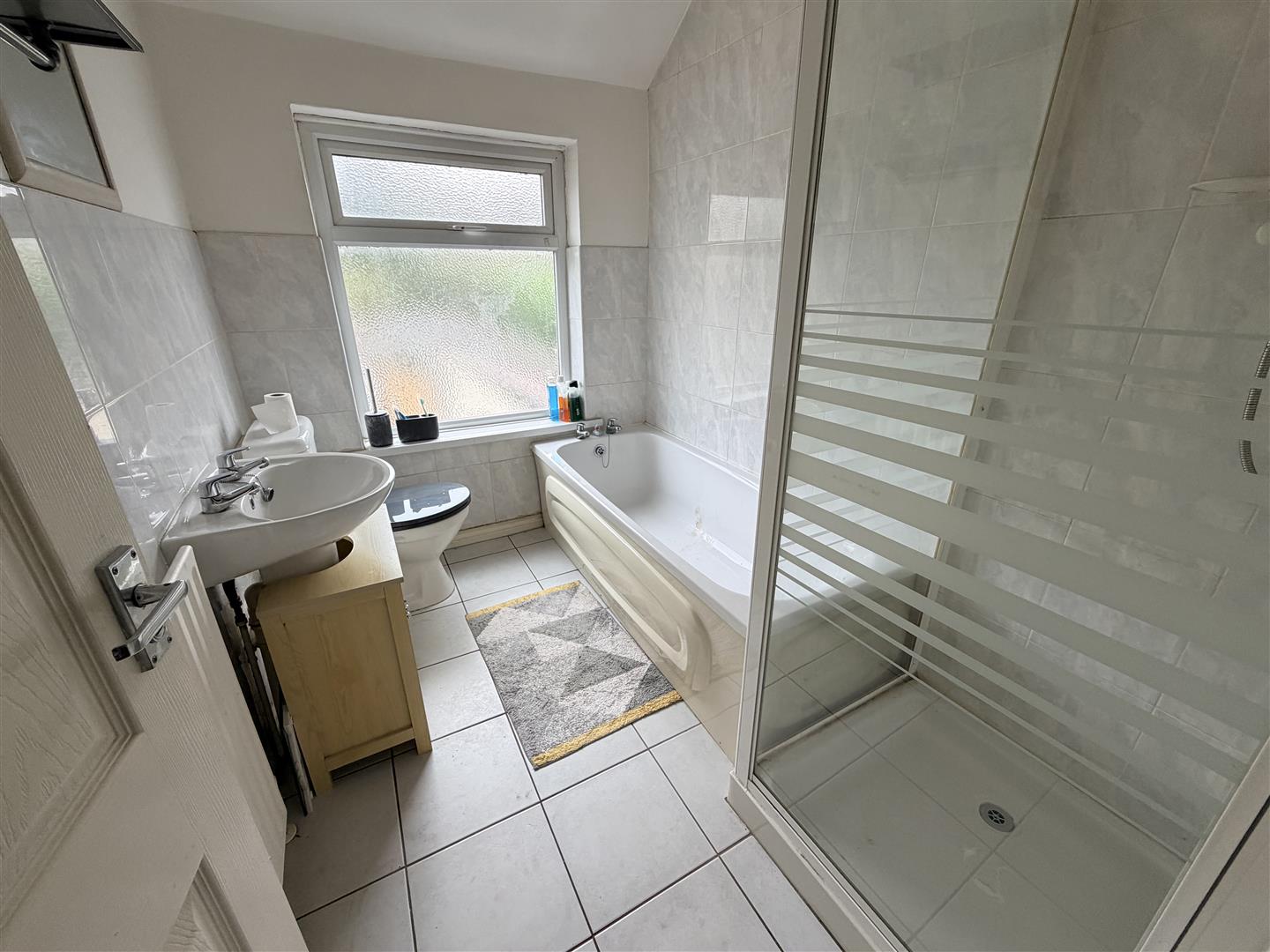 Fitted with four piece suite comprising panelled bath, pedestal wash hand basin, shower cubicle and low-level WC, tiled splashbacks, obscure double glazed window to rear, radiator, ceramic tiled flooring and sunken ceiling spotlights.