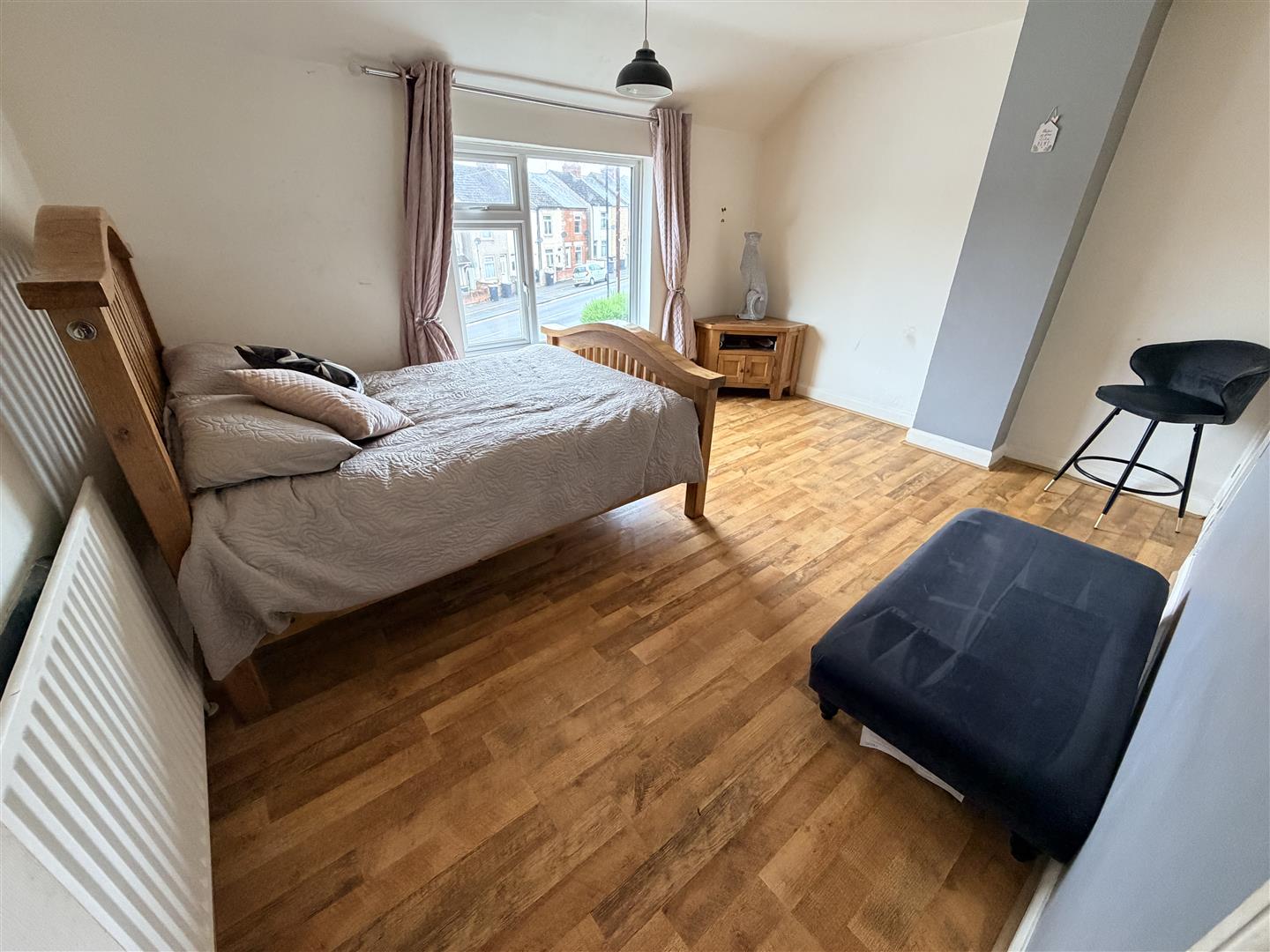 Double glazed bay window to front, living flame effect electric fire set in Adam style surround, radiator, wooden laminate flooring, door to: