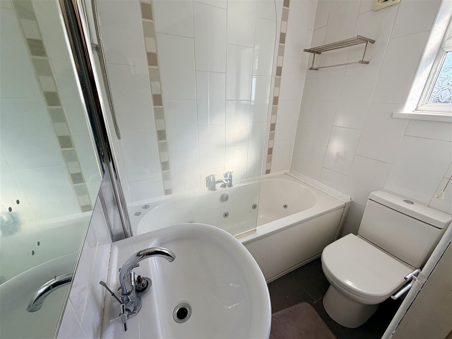 Fitted with three piece suite comprising spa bath with shower over and glass screen, pedestal wash hand basin with mixer tap and low-level WC, ceramic tiling to all walls, extractor fan, obscure double glazed window to side and underfloor heating.