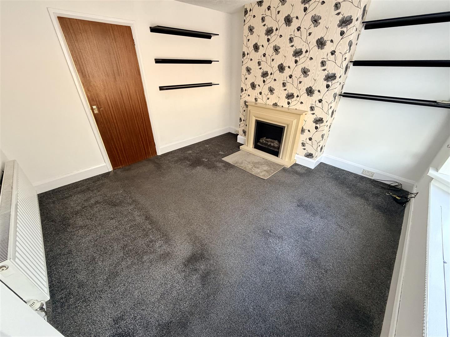 Double glazed bow window to front, log effect electric fire set in feature surround, radiator, telephone point, TV point, textured ceiling, door to: