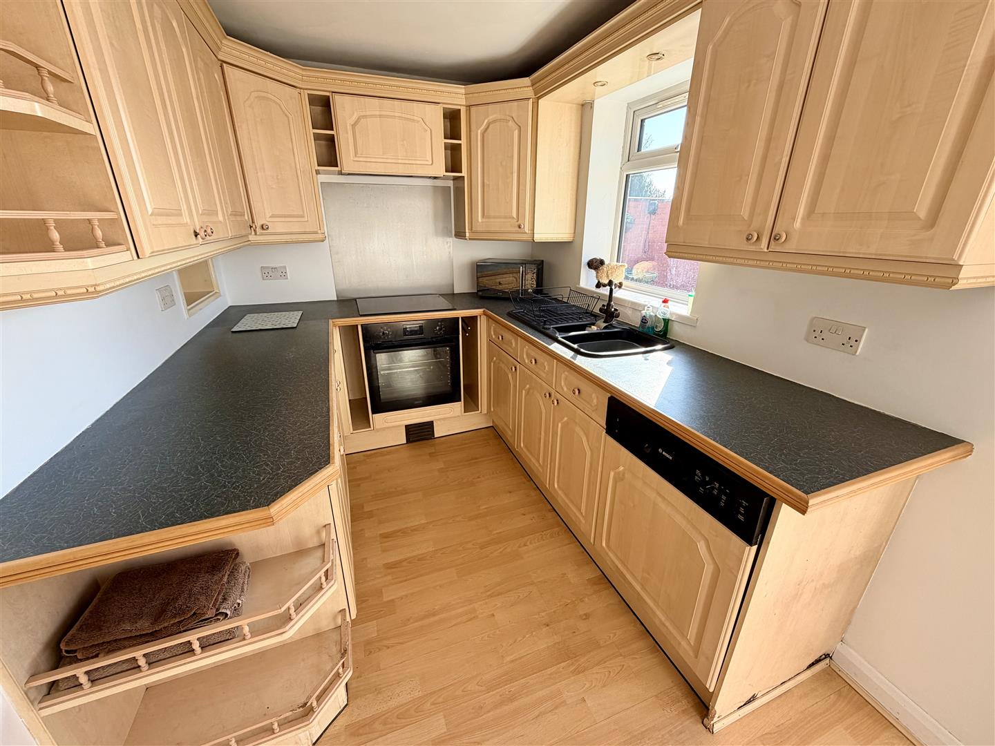 Fitted with a matching range of base and eye level units with worktop space over, 1+1/4 bowl polycarbonate sink unit with single drainer and mixer tap, built-in dishwasher, electric fan assisted oven, four ring induction hob with extractor hood over, double glazed window to rear, double radiator, wooden laminate flooring, double glazed double doors to garden.