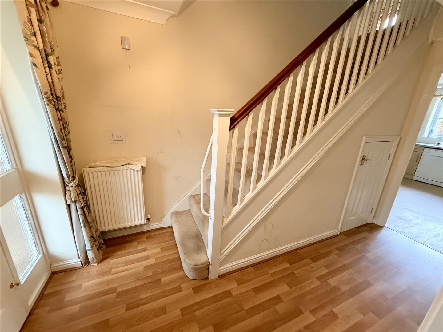 Double radiator, coving to ceiling, stairs to first floor landing with under-stairs storage cupboard and spindles, doors to: