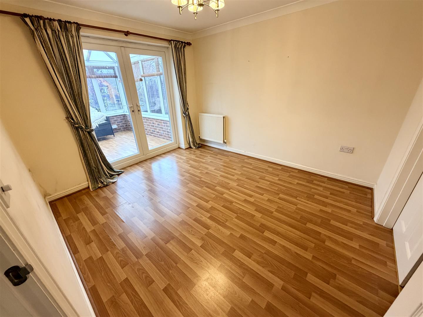 Radiator, wooden laminate flooring, coving to ceiling, double glazed double door to conservatory, door to: