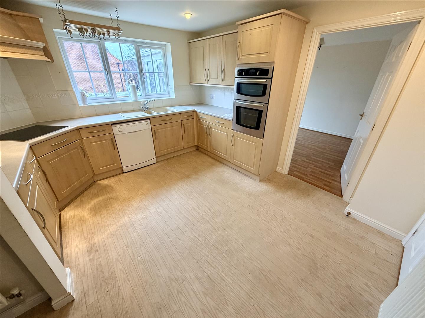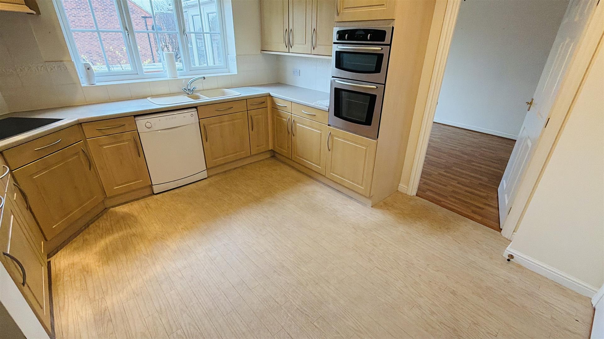 Fitted with a matching range of base and eye level units with worktop space over, 1+1/4 bowl polycarbonate sink unit with single drainer and mixer tap, plumbing for, space for fridge/freezer, eye level electric fan assisted oven, four ring induction hob with extractor hood over, integrated fridge, double glazed window to rear, double radiator, sunken spotlights, door leading back to hallway and archway to