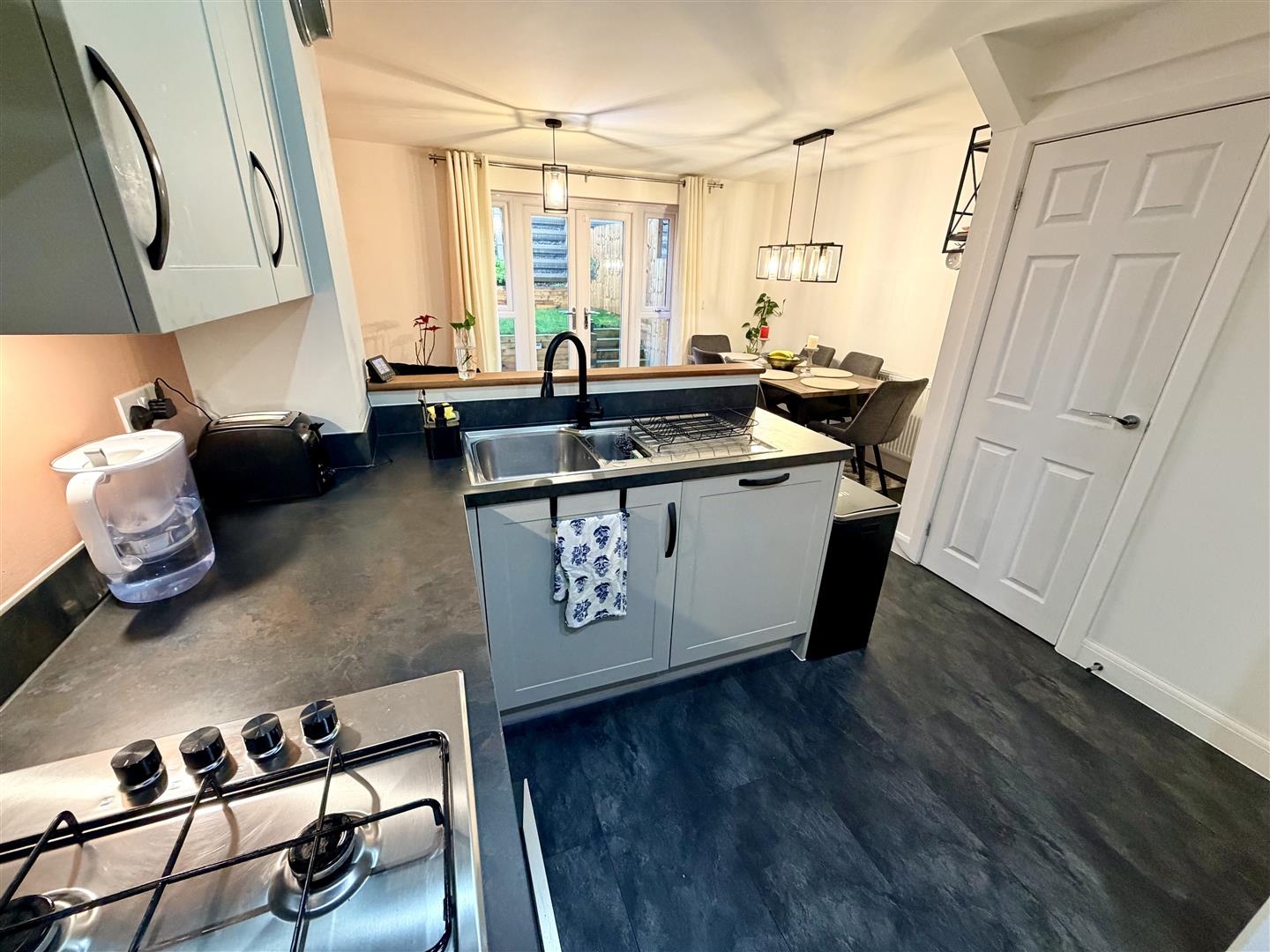 Fitted with a matching range of base and eye level units with worktop space over, 1+1/4 bowl stainless steel sink unit with single drainer and swan neck mixer tap, integrated fridge/freezer, dishwasher and automatic washing machine, fan assisted oven, four ring gas hob with extractor hood over, sunken ceiling spots to kitchen area, double glazed double doors to garden, door to under-stairs storage cupboard.