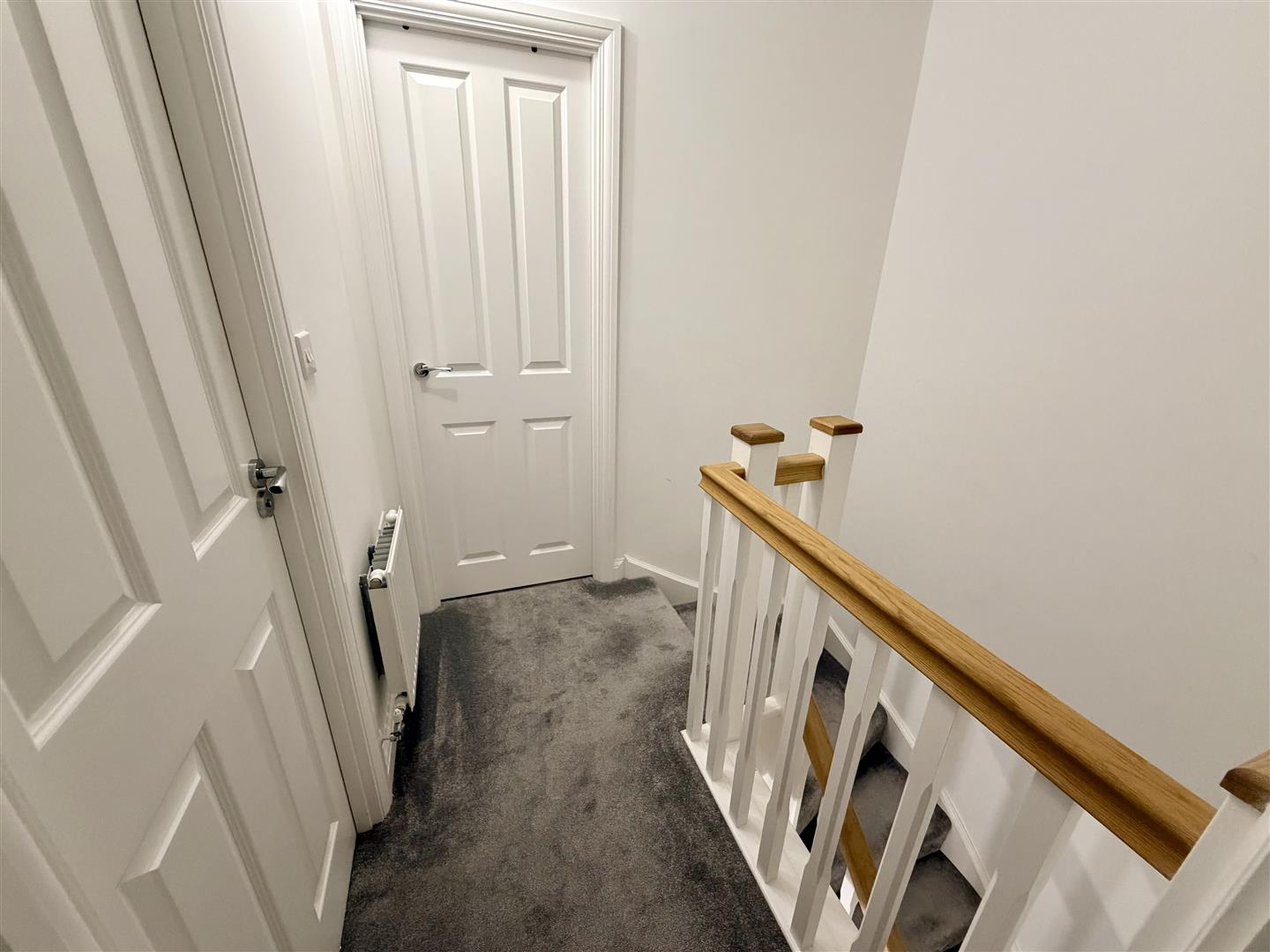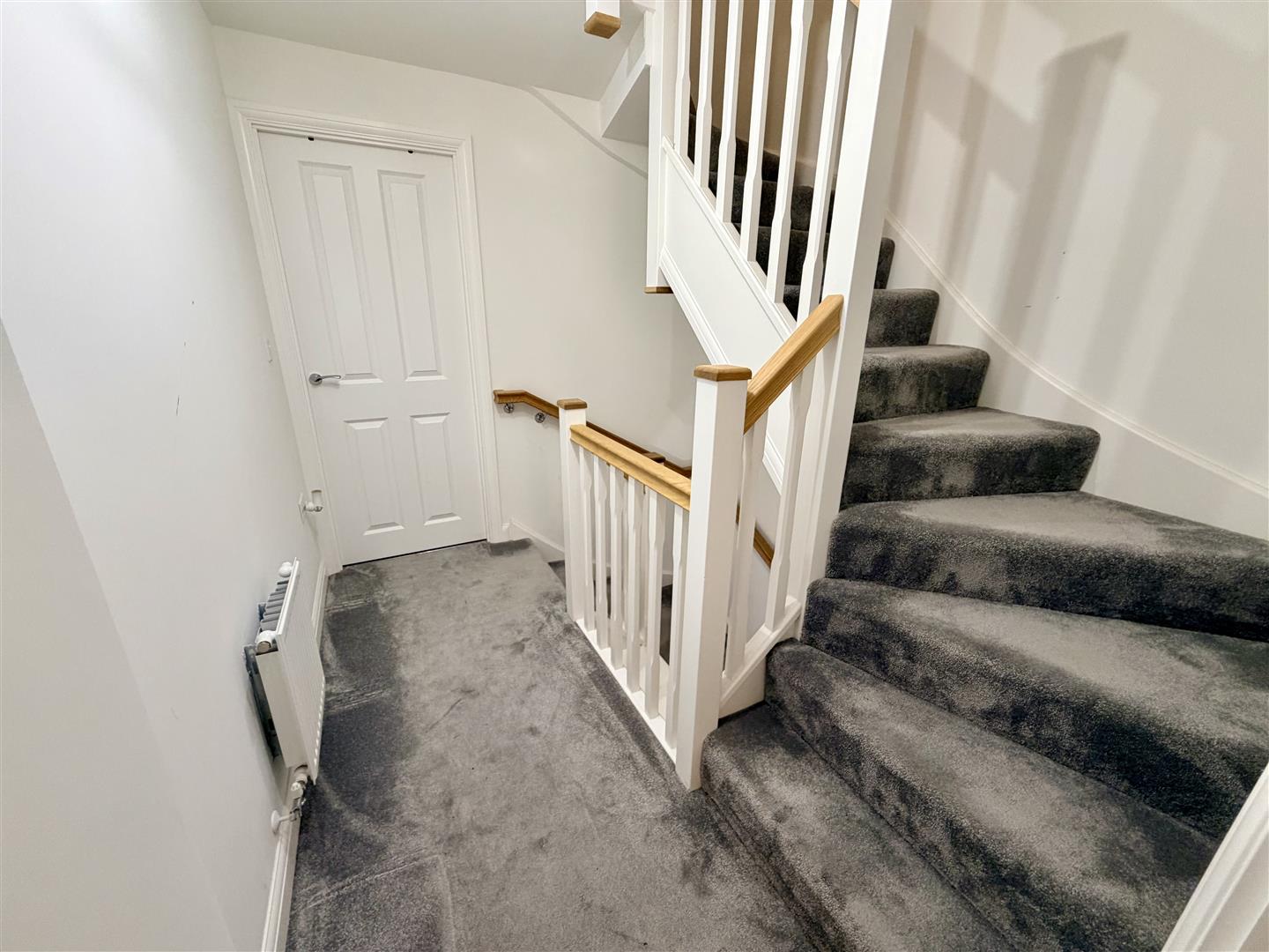 Radiator, stairs to second floor landing with spindles, doors to: