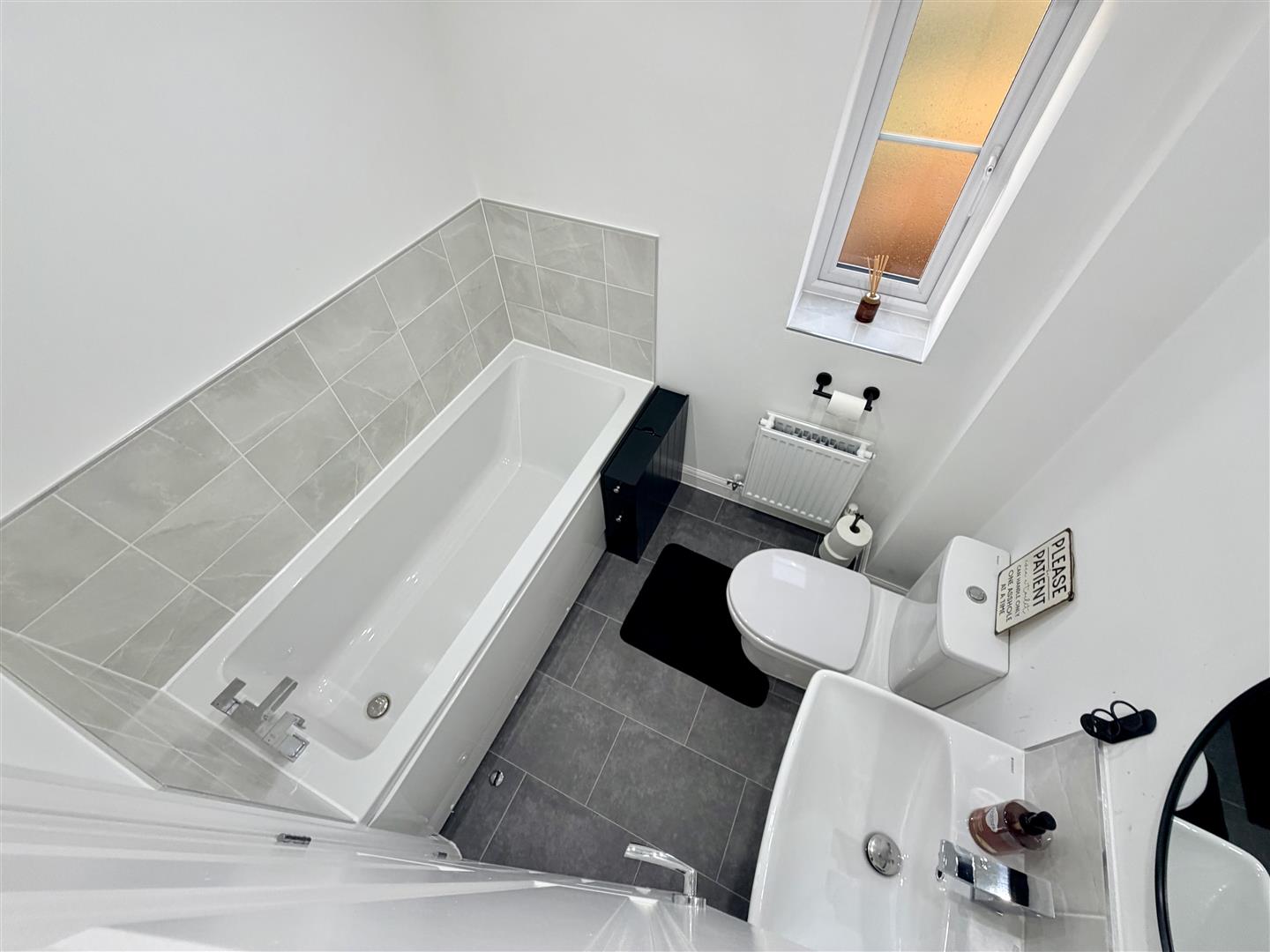 Fitted with three piece suite comprising panelled bath, pedestal wash hand basin with mixer tap and low-level WC, tiled splashbacks, extractor fan, double glazed window to side, double radiator, sunken ceiling spotlights.