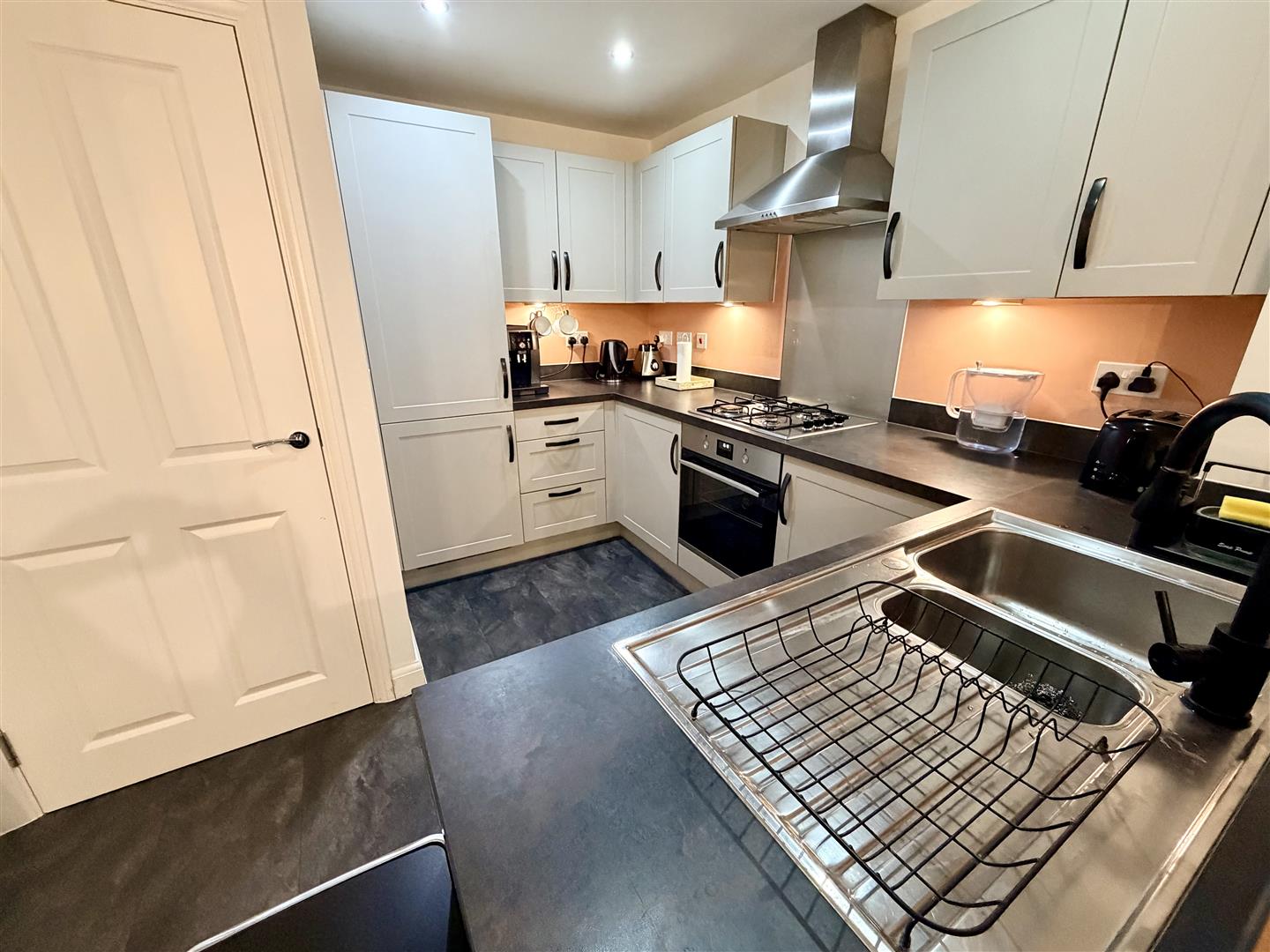 Fitted with a matching range of base and eye level units with worktop space over, 1+1/4 bowl stainless steel sink unit with single drainer and swan neck mixer tap, integrated fridge/freezer, dishwasher and automatic washing machine, fan assisted oven, four ring gas hob with extractor hood over, sunken ceiling spots to kitchen area, double glazed double doors to garden, door to under-stairs storage cupboard.