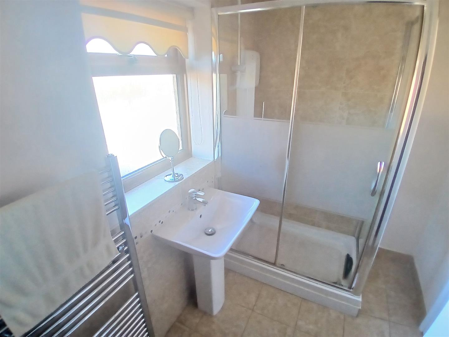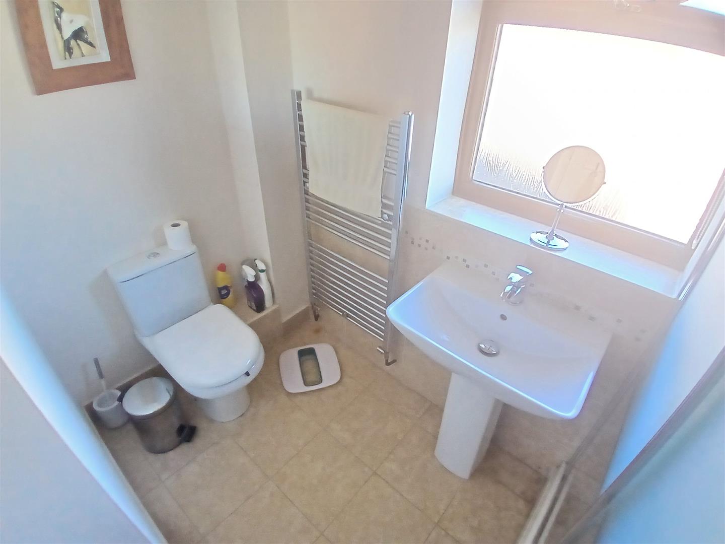 Fitted with shower cubicle and screen, WC, hand wash basin with taps over, heated towel rail and obscure double glazed window to rear.