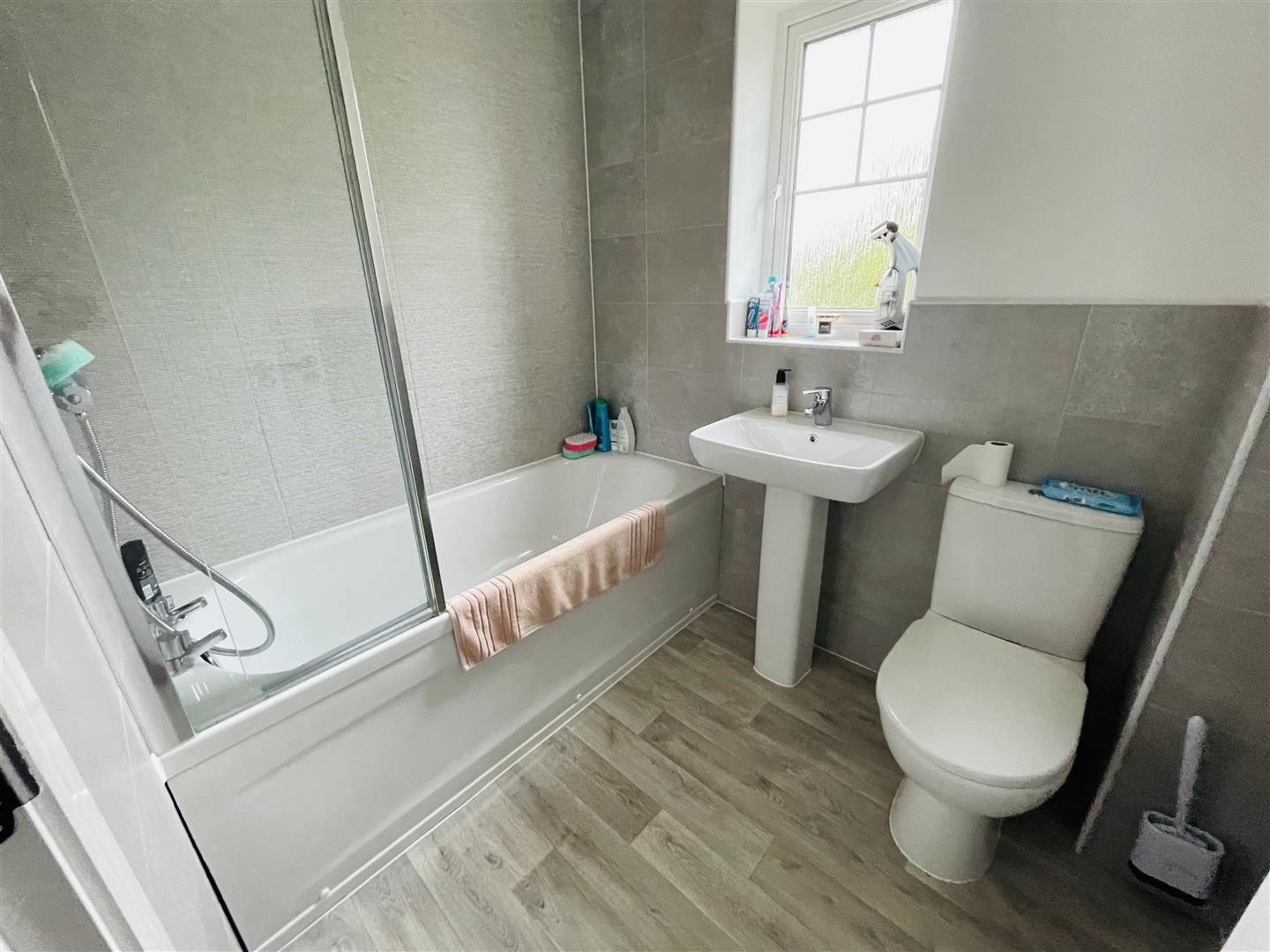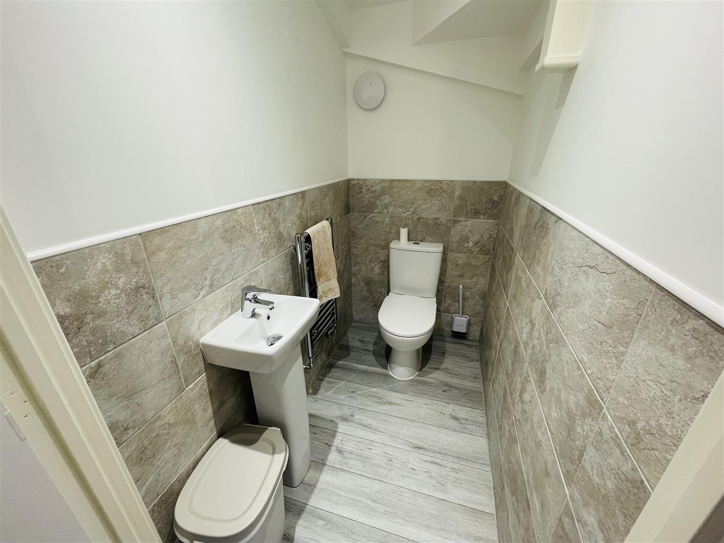 Fitted with two piece suite pedestal wash hand basin with mixer tap, low-level WC and heated towel rail, extractor fan, half height tiling to all walls, wooden laminate flooring.