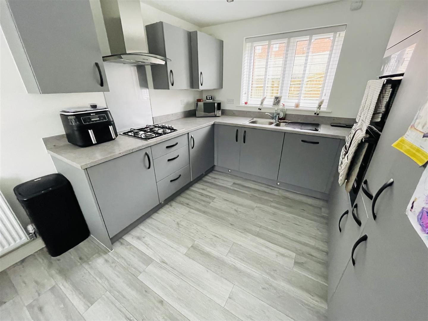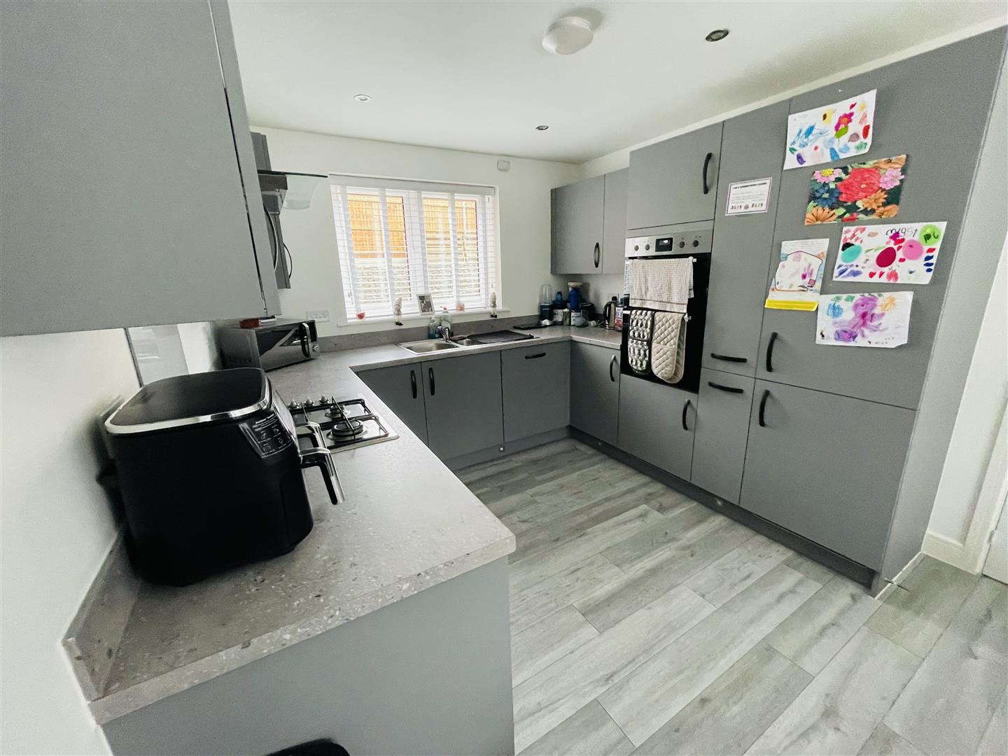 Fitted with a matching range of base and eye level units with worktop space over, 1+1/4 bowl stainless steel sink unit with single and stainless steel mixer tap, kickboard lighting, integrated fridge/freezer, dishwasher, washer dryer, fitted eye level electric fan assisted double oven, four ring gas hob with extractor hood over, double glazed window to rear, double glazed window to front, double radiator, wooden laminate flooring, sunken low-voltage ceiling spotlights, concealed gas combination boiler serving heating system and domestic hot water with extractor fan.