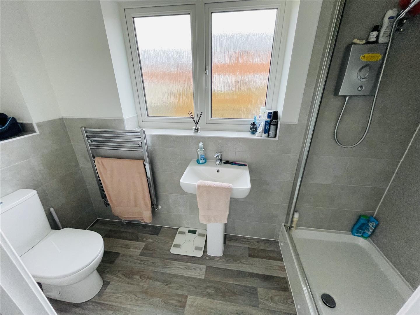 Fitted with three piece suite comprising tiled shower enclosure, vanity wash unit with cupboard under and mixer tap, low-level and heated towel rail, extractor fan, obscure double glazed window to rear with sunken ceiling spotlights.