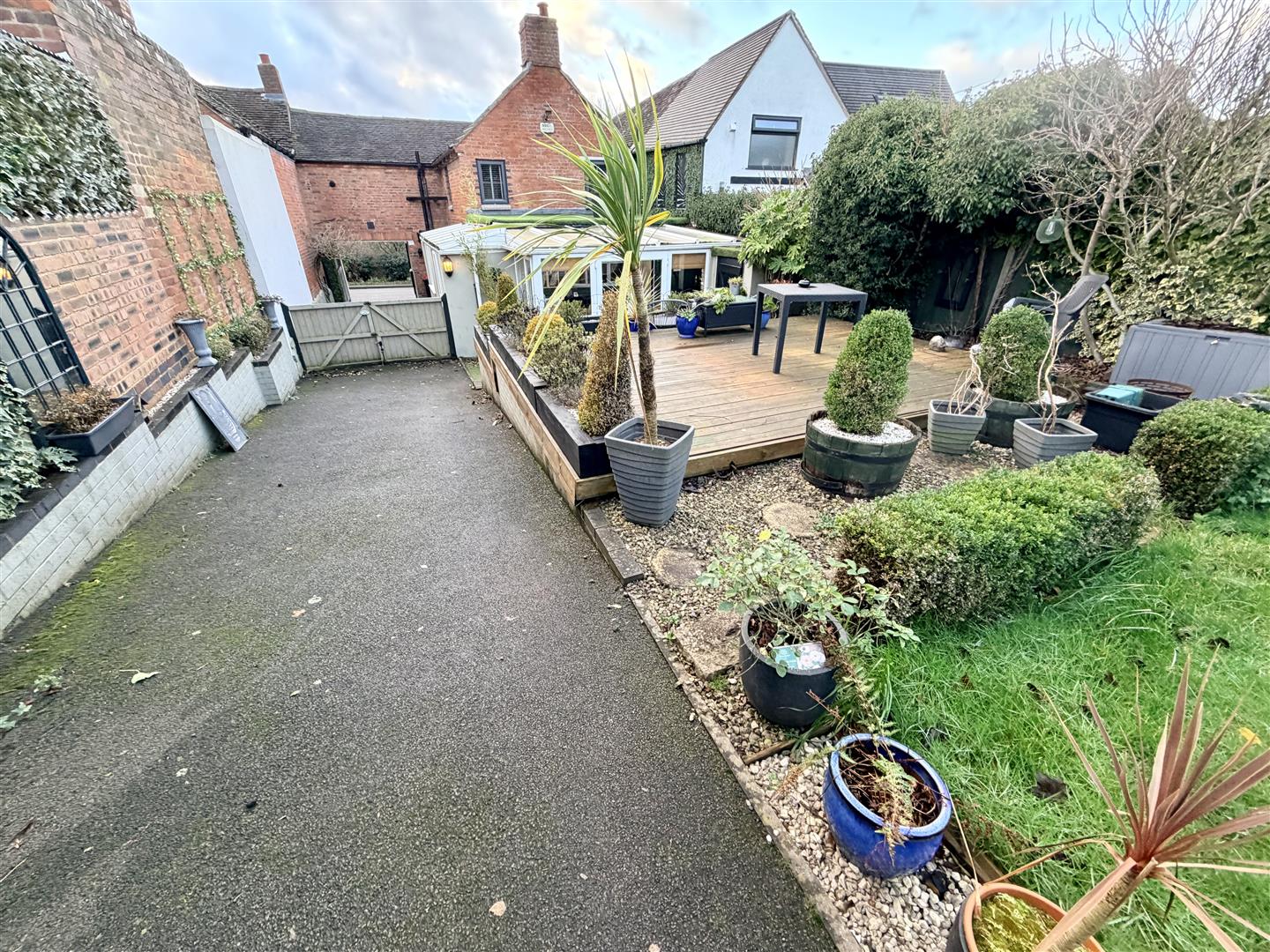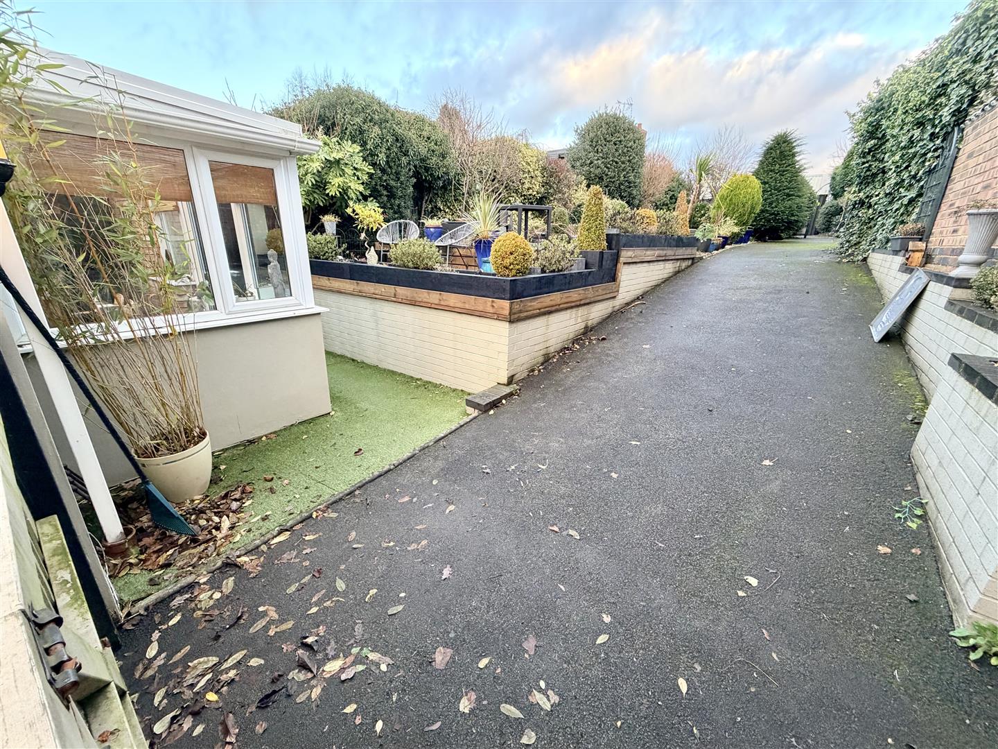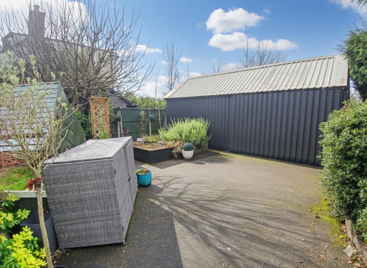To the rear is an enclosed garden mainly laid to lawn with shrub borders, large storage shed, extending driveway, gated access to the front. The front has a foregarden with path leading to entrance.