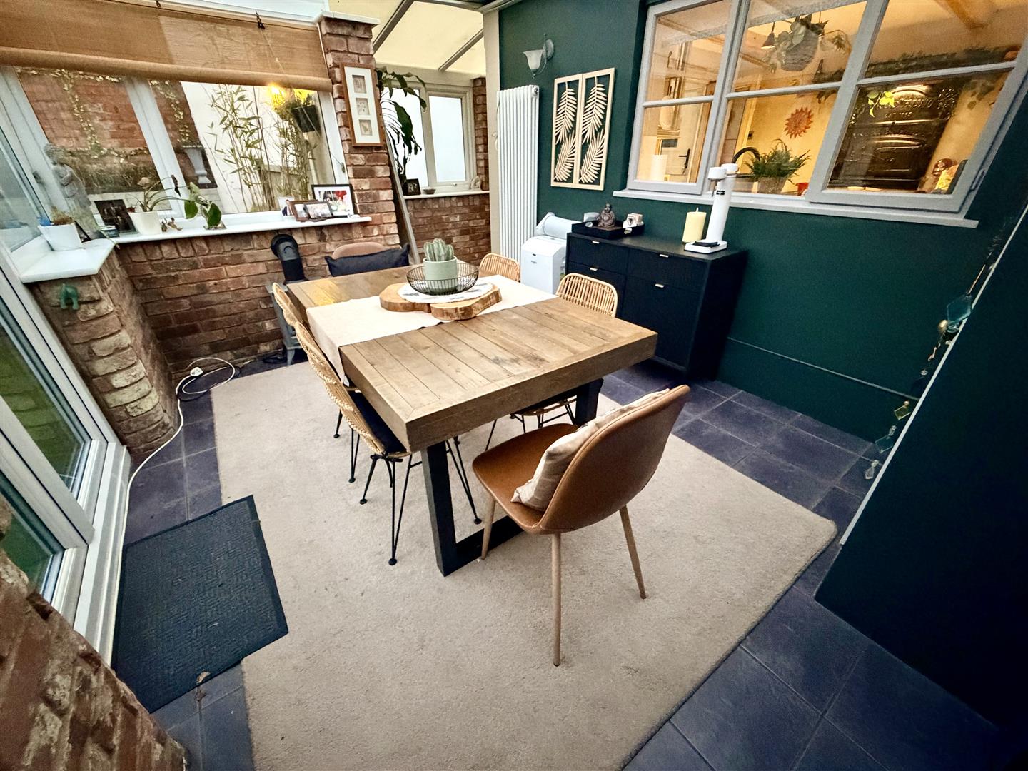 Half brick and double glazed construction with polycarbonate roof, power and light connected, radiator, ceramic tiled flooring, double glazed french double doors to garden, door to:
