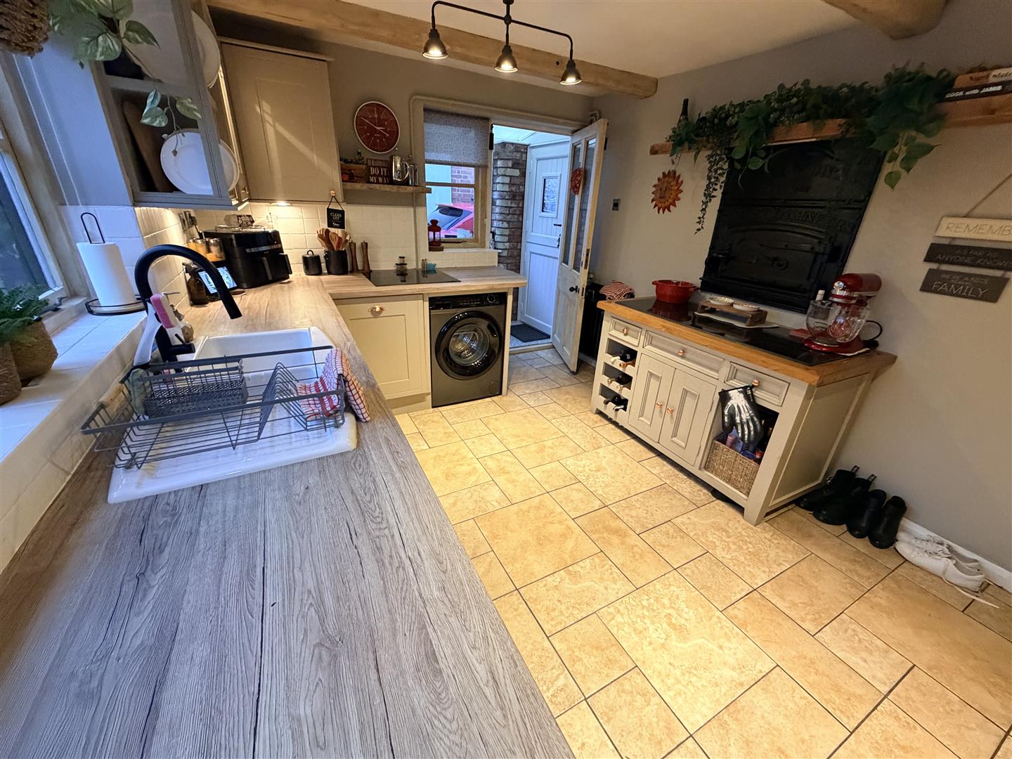 This cottage style kitchen is fitted with a matching range of base and eye level units with worktop space over, 1+1/4 bowl sink unit with single drainer, mixer tap and tiled splashbacks, integrated dishwasher, plumbing for washing machine, space for fridge/freezer, built-in eye level electric fan assisted double oven, induction hob, window to rear, ceramic tiled flooring and feature beams on the ceiling maintaining character and charm, door to: