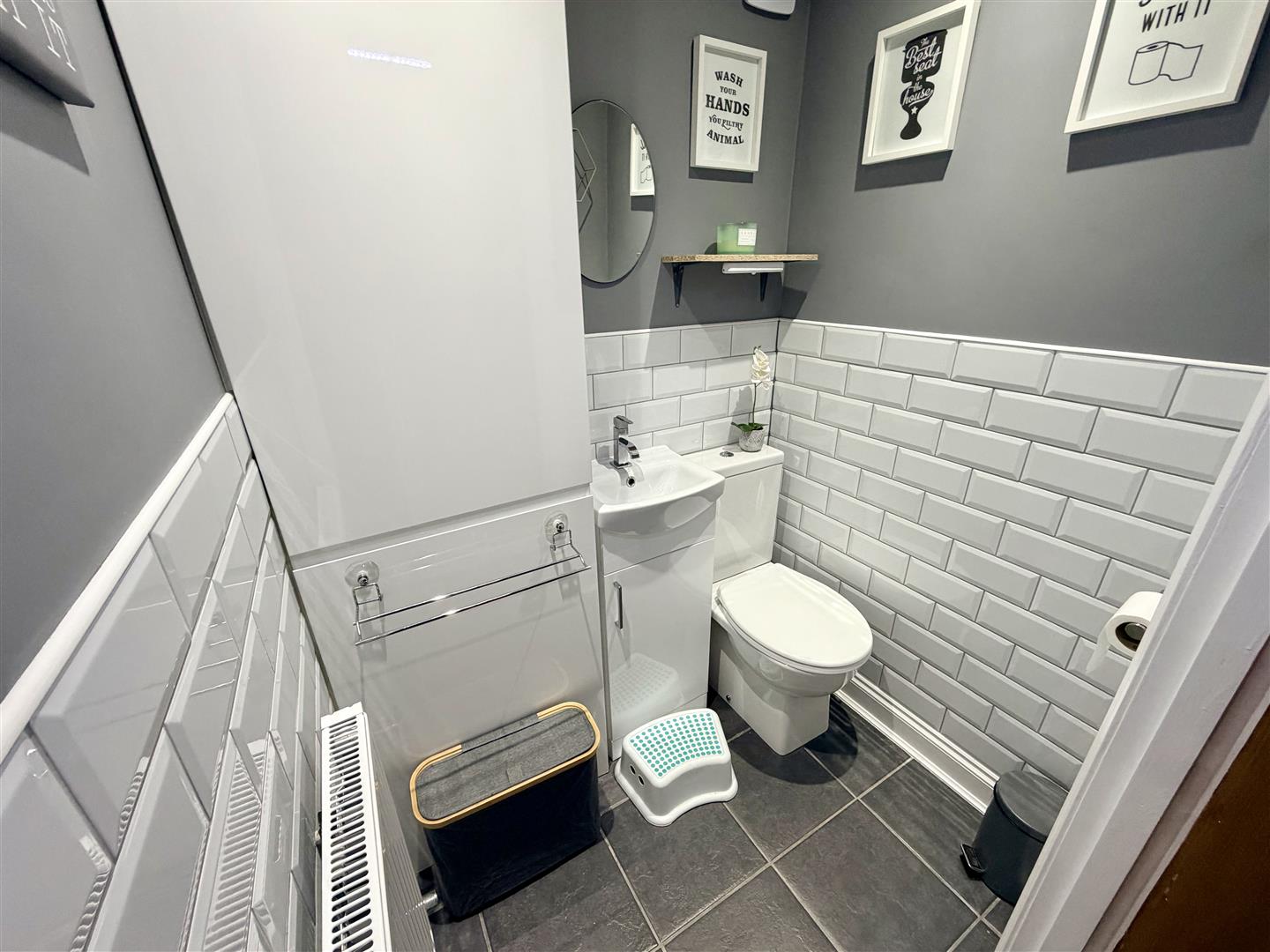 Fitted with two piece suite comprising, vanity wash unit with cupboard under and mixer tap, low-level WC and extractor fan, ceramic and half height tiling to all walls, radiator, ceramic tiled flooring, sunken spotlights, concealed combination boiler serving heating system and domestic hot water.