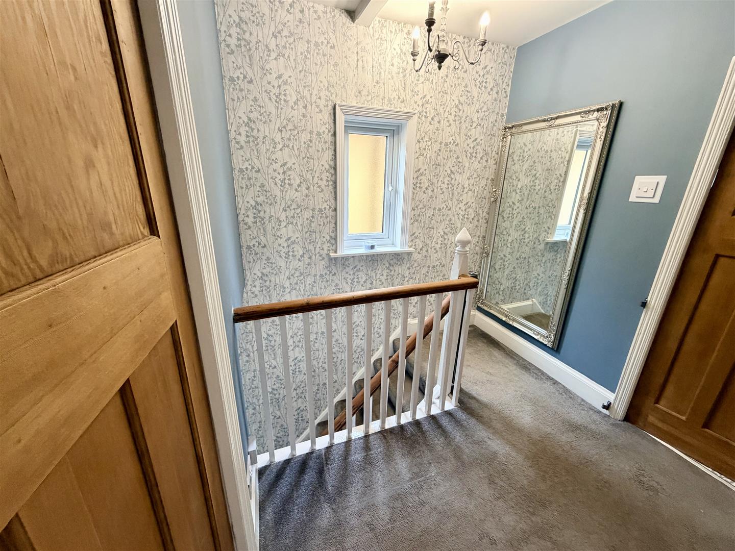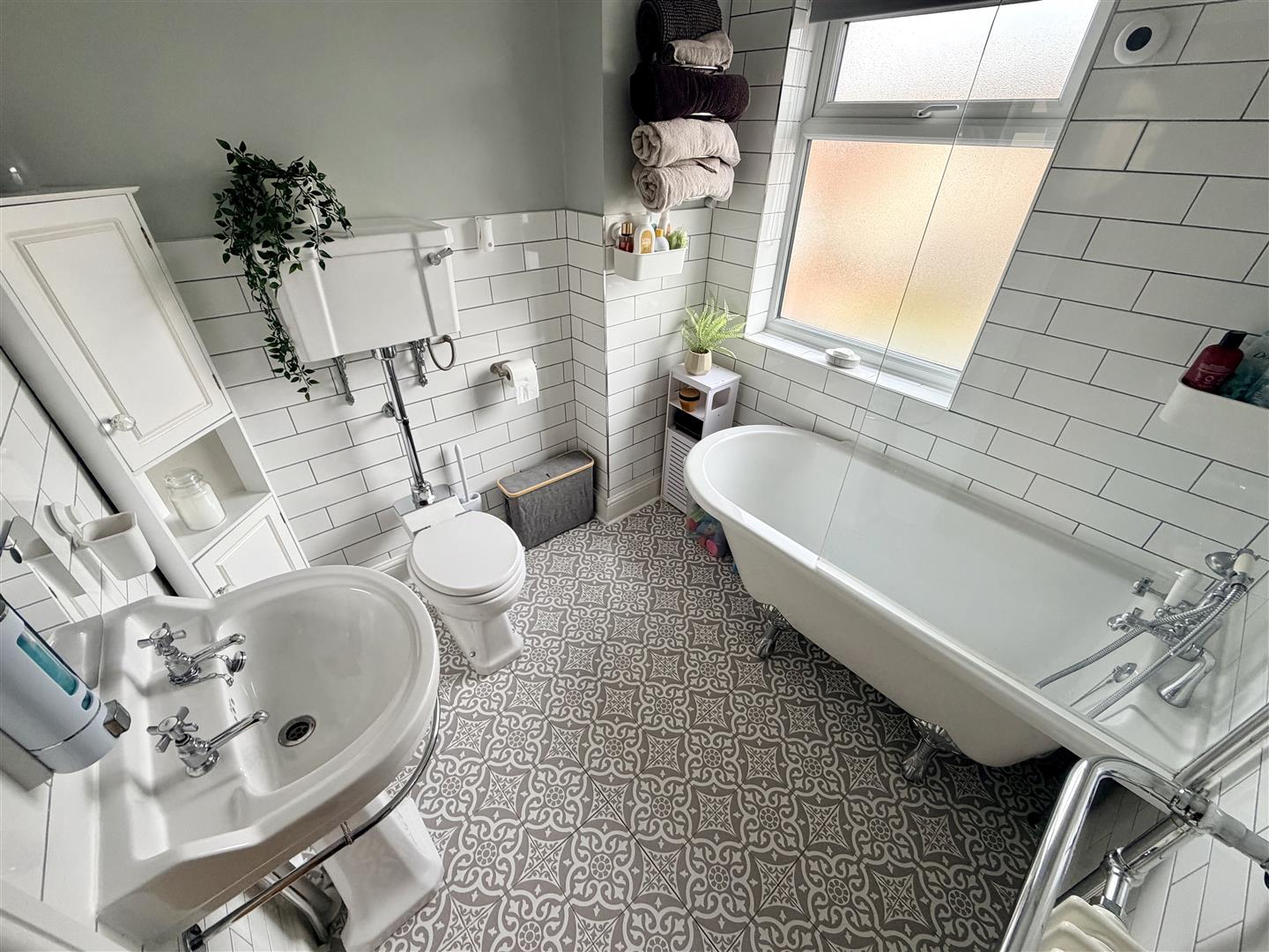 Recently refitted with three piece Victorian style suite comprising roll top bath with ornamental feet and independent shower over, matching telephone style mixer tap and glass screen, pedestal wash hand basin and low-level WC, tiled splashbacks, heated towel rail incorporating radiator, obscure double glazed window to rear, ceramic tiled flooring.