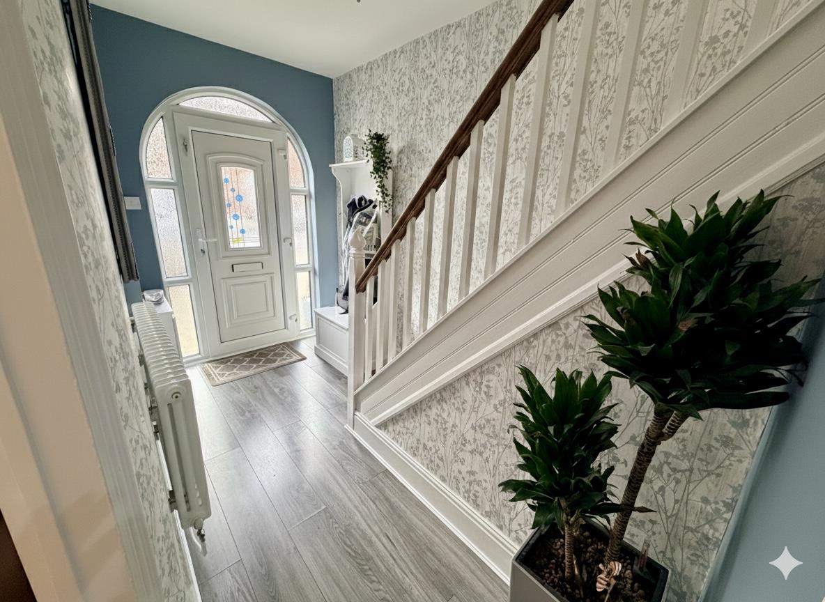 Radiator, wooden laminate flooring, stairs to first floor landing with spindles, doors to: