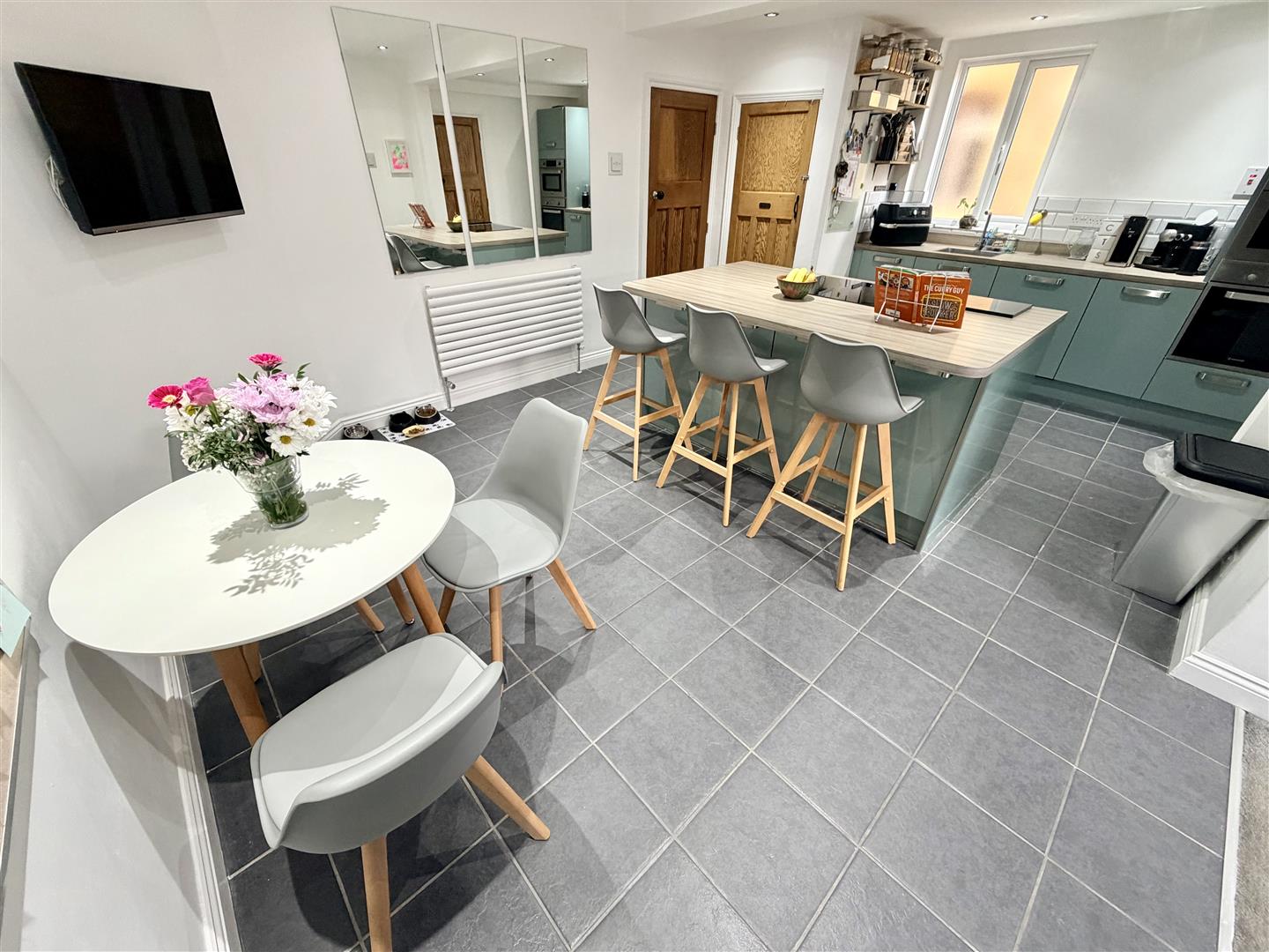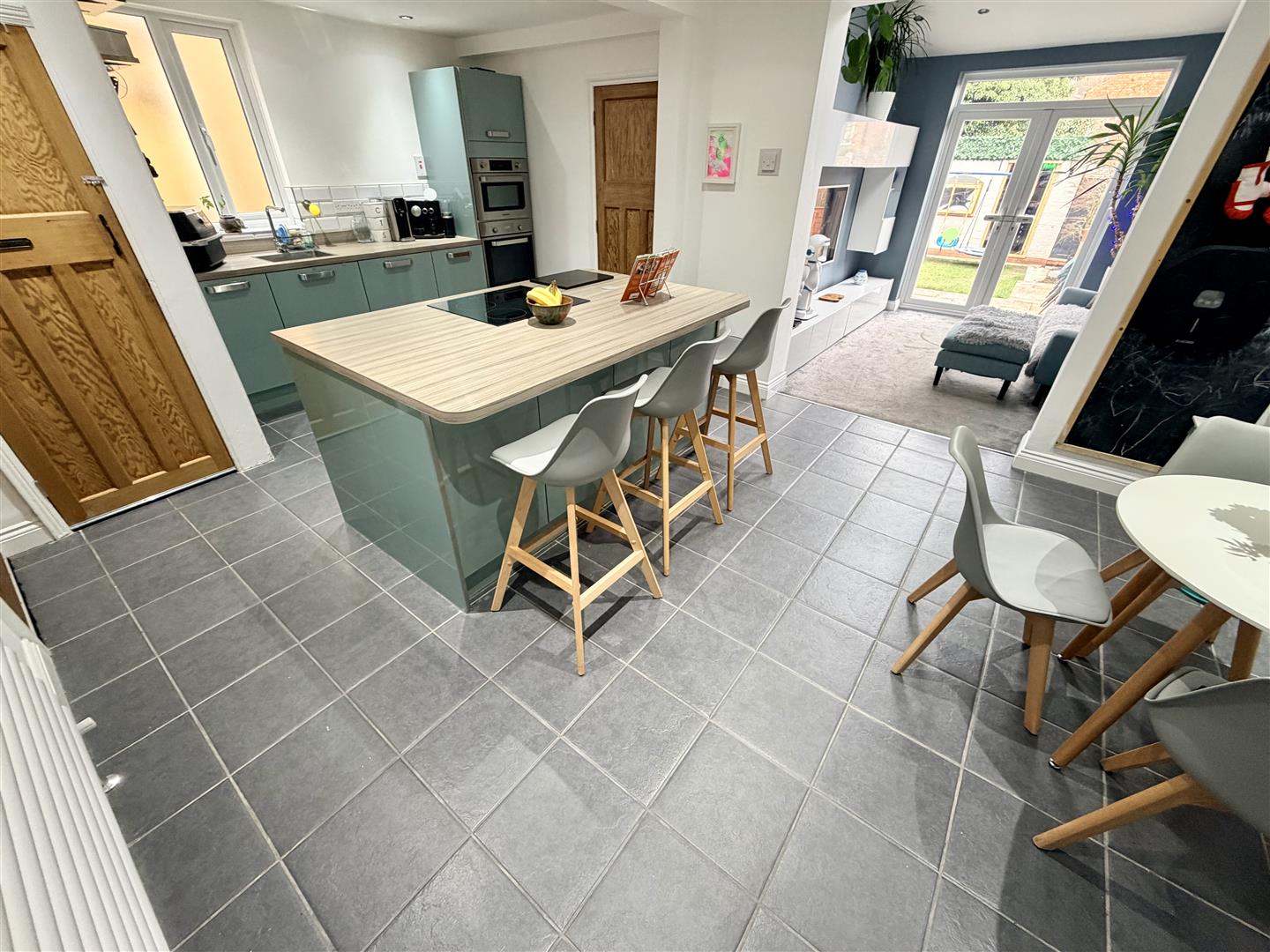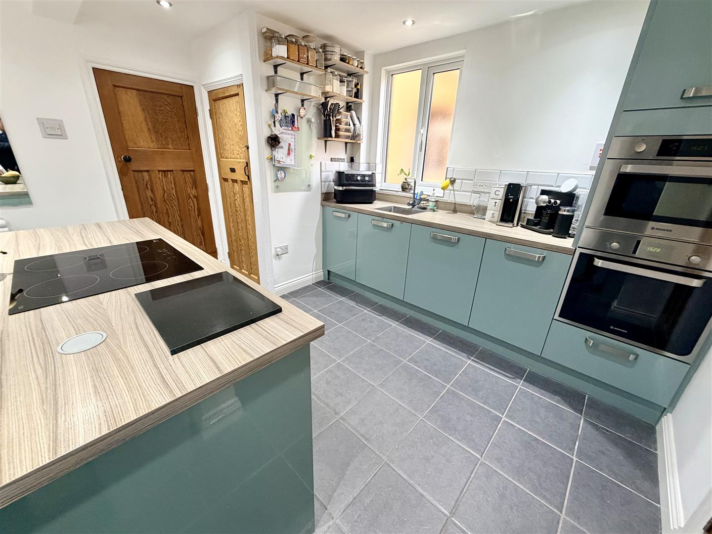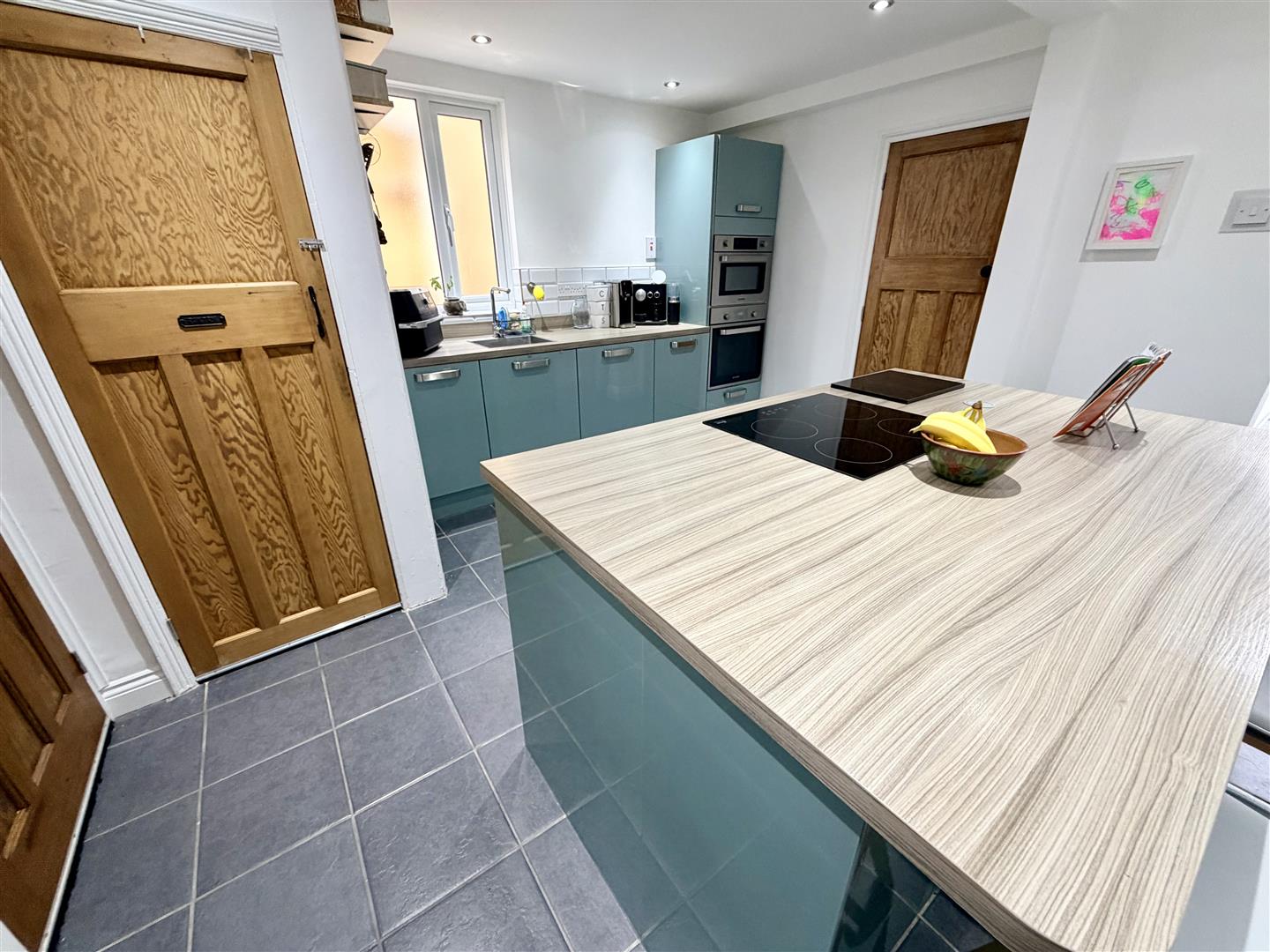 Fitted with a matching range of base units with worktop space over, matching island unit with cupboards drawers under and induction hob, stainless steel sink unit with mixer tap, tiled splashbacks, integrated dishwasher, built-in eye level electric fan assisted oven, built in combination microwave and fan assisted oven, obscure double glazed window to side, radiator, ceramic tiled flooring, sunken ceiling spotlights, door to pantry and utility room, opening, to: