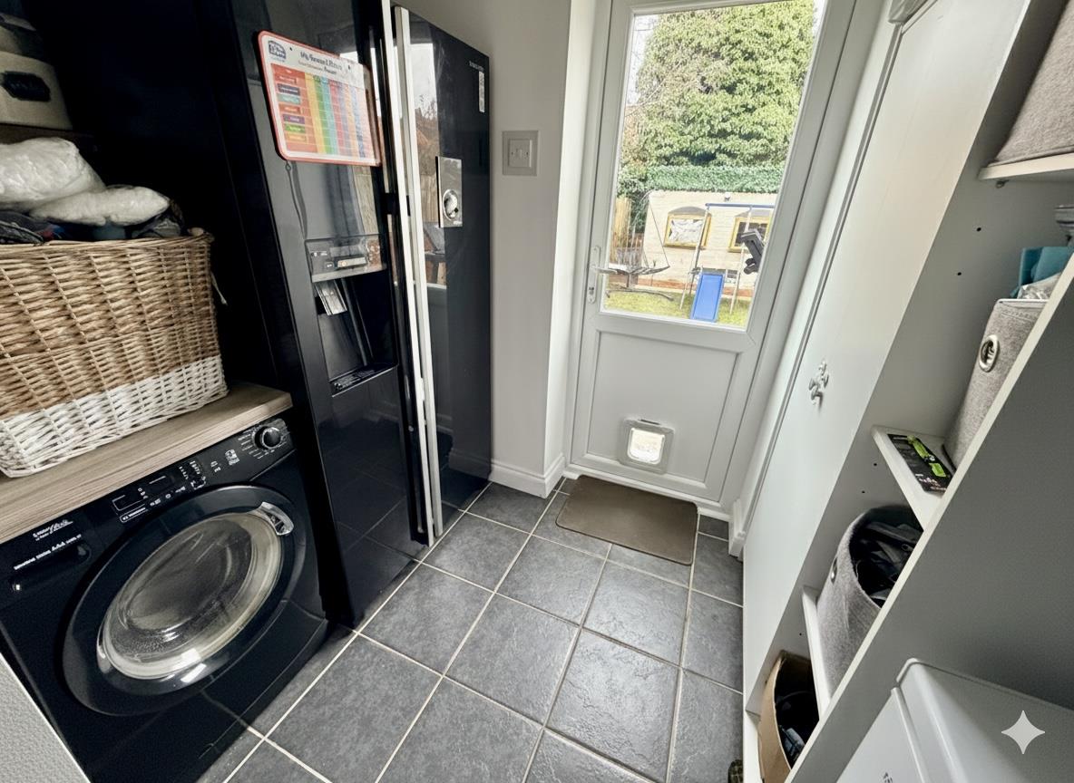 Plumbing for washing machine, space for American style fridge/freezer and additional appliance, ceramic tiled flooring, sunken spotlights, double glazed door to garden, door to:
