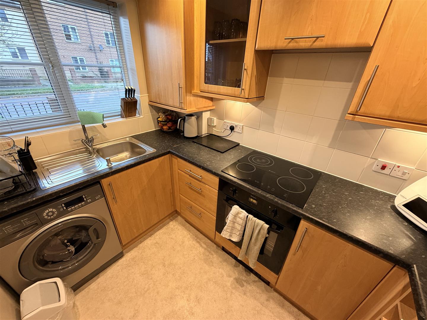 Fitted with a matching range of base and eye level units with worktop space over, stainless steel sink unit with tiled splashbacks, plumbing for washing machine, space for fridge/freezer, electric fan assisted oven, four ring electric hob with pull out extractor hood over, double glazed window to front, radiator and sunken ceiling spotlights.