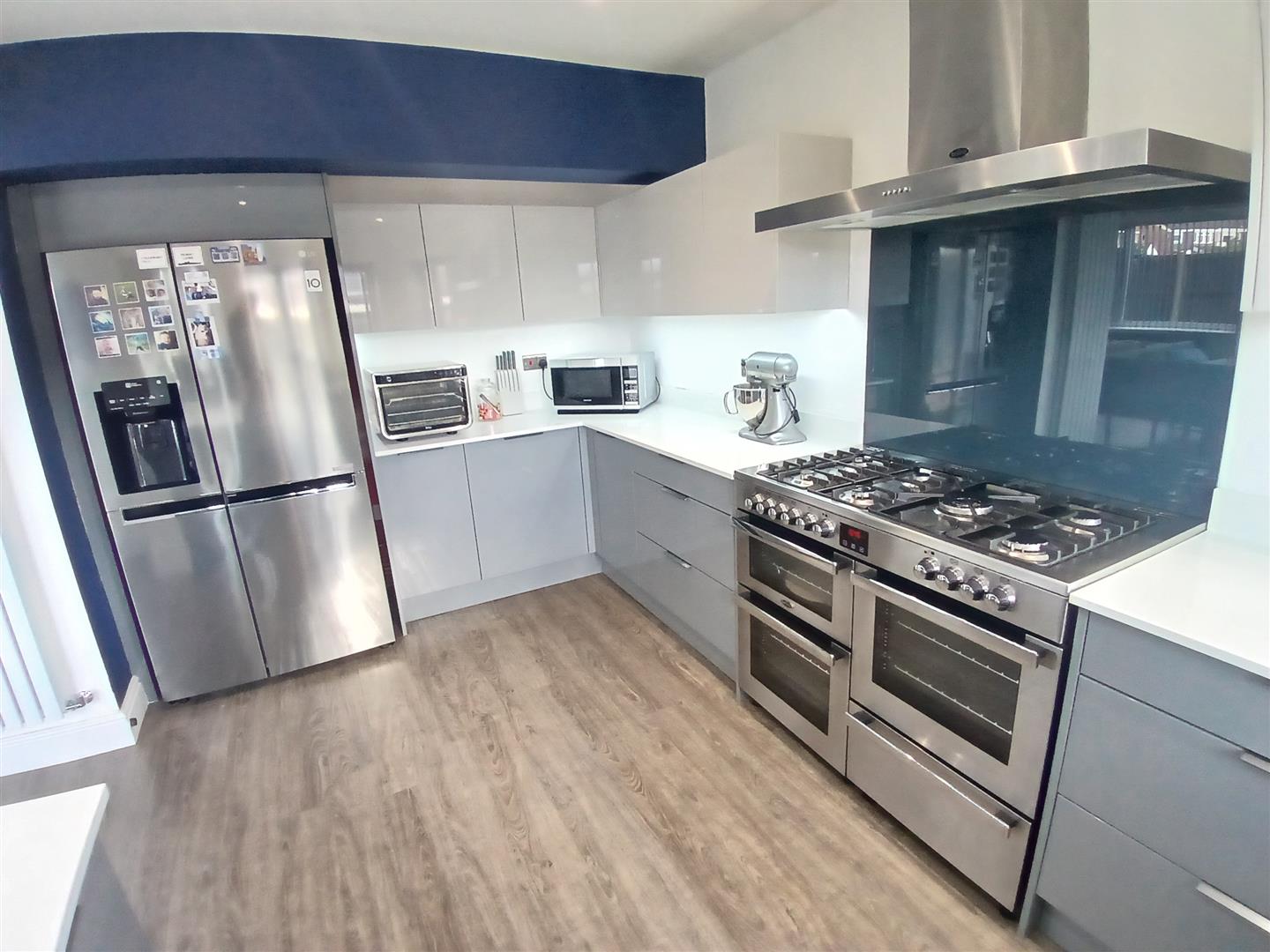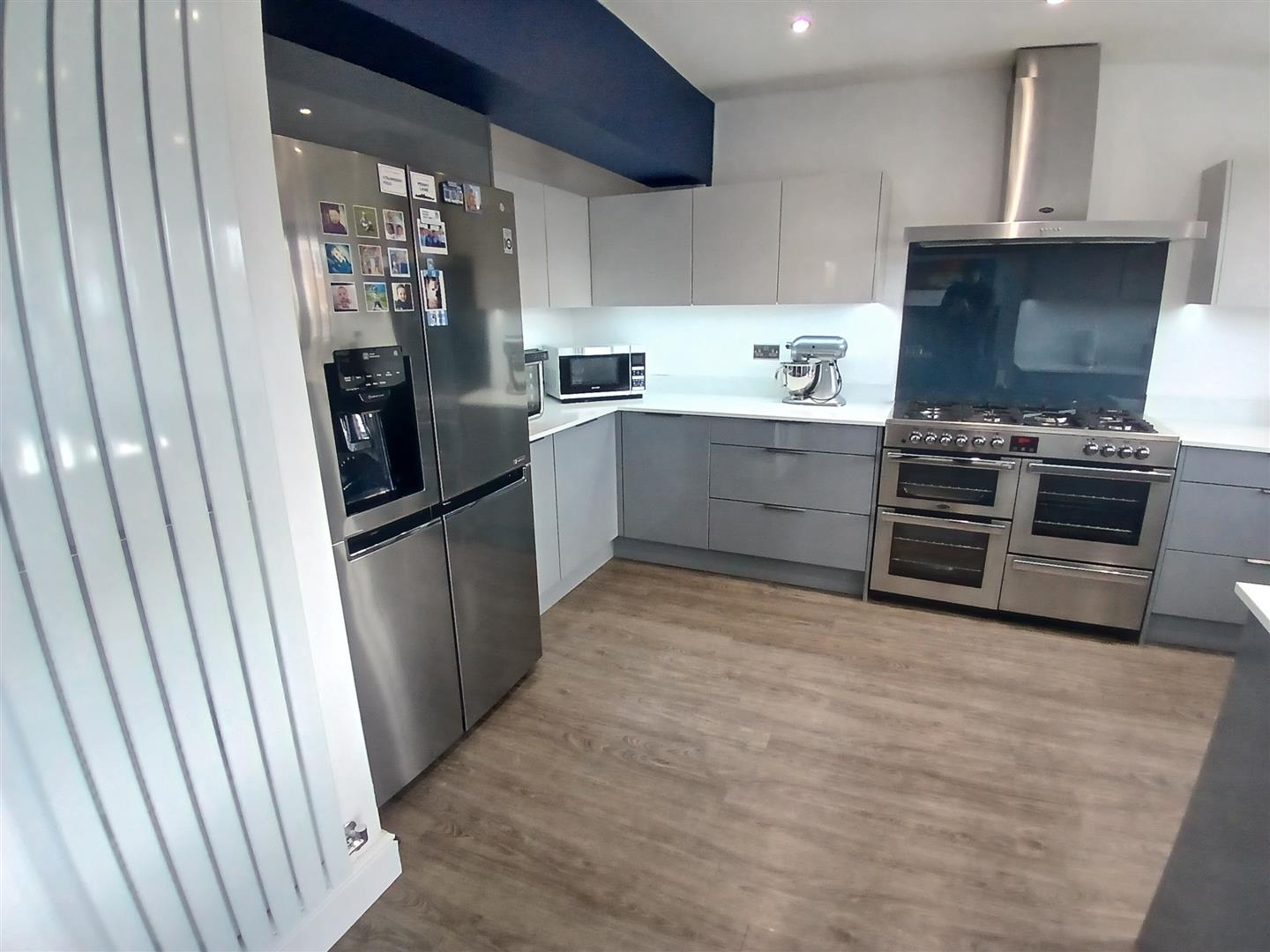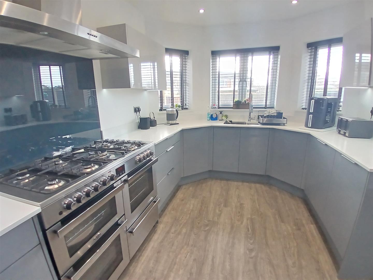 Fitted with a matching range of base and eye level gloss units with worktop space over, stainless steel sink unit with swan neck taps over and drainer, integrated dishwasher, space for fridge/freezer and cooker with fitted extractor hood over and double glazed windows to rear.